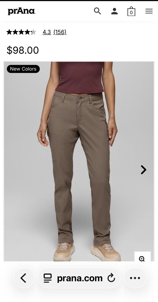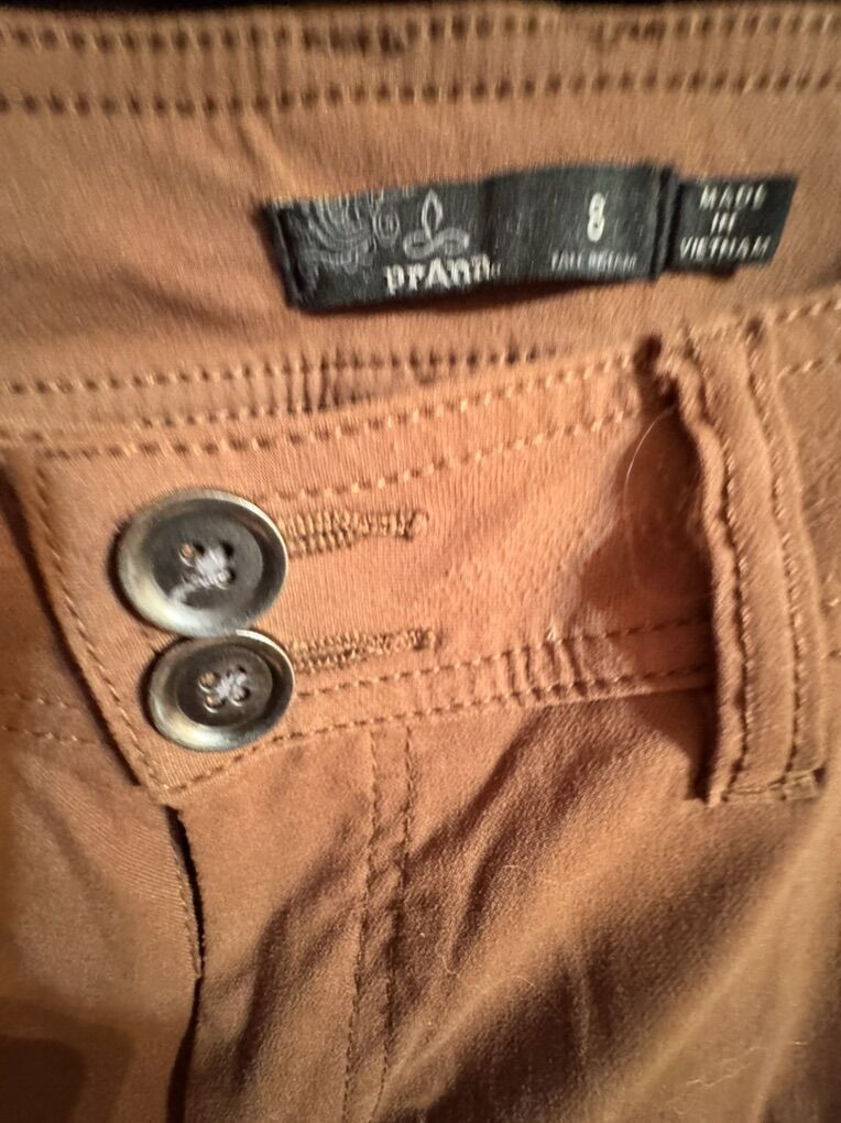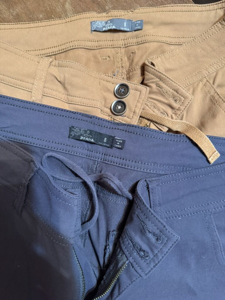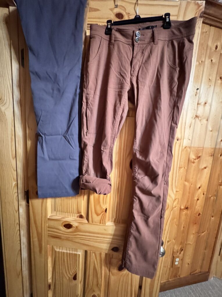 I wore these for work with a blazer and not for hiking or climbing- great condition. 3 colors. Dark grey, coppery brown, mustard tan. Price is for one pair - can negotiate a bundle with discount. Love Prana. More to post soon. Sold at REI for $98/ pair The pants have an cuff feature to make capris. As shown in images