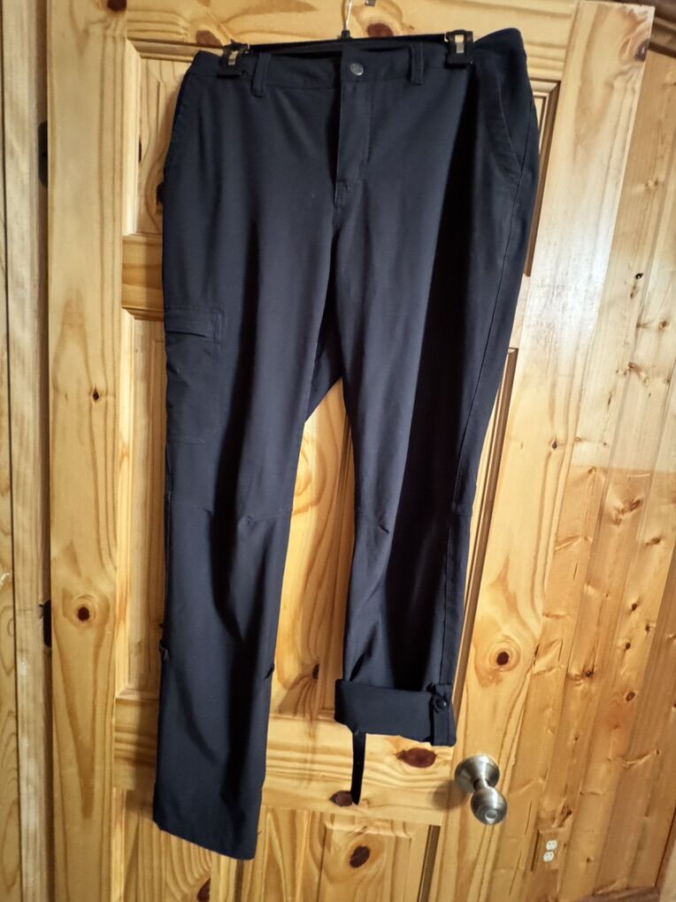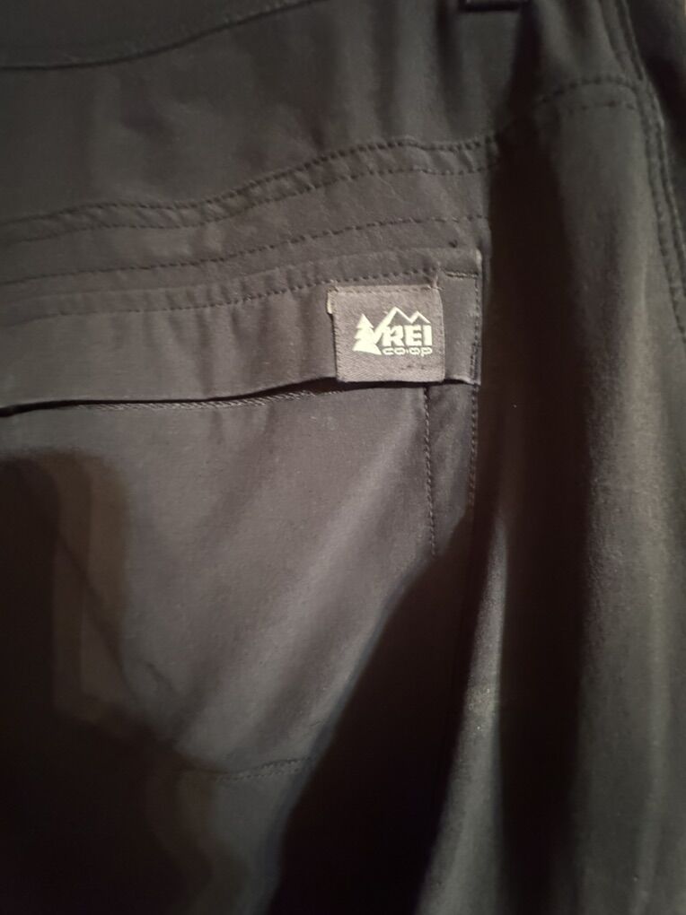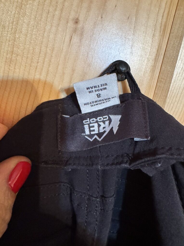 Womens black REI stretch hike pants. Great secure pockets, and zippers. Lightweight. Size 8. Cuffs up into a capri if you like - great for walking through water.