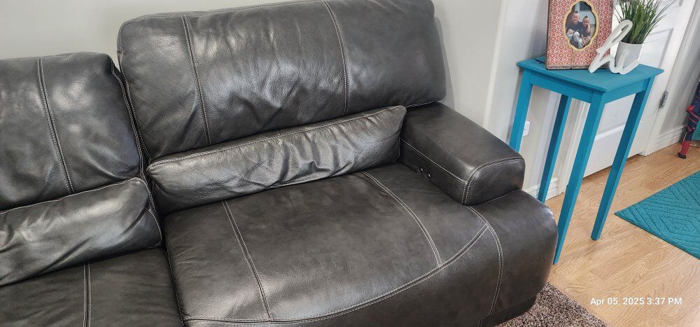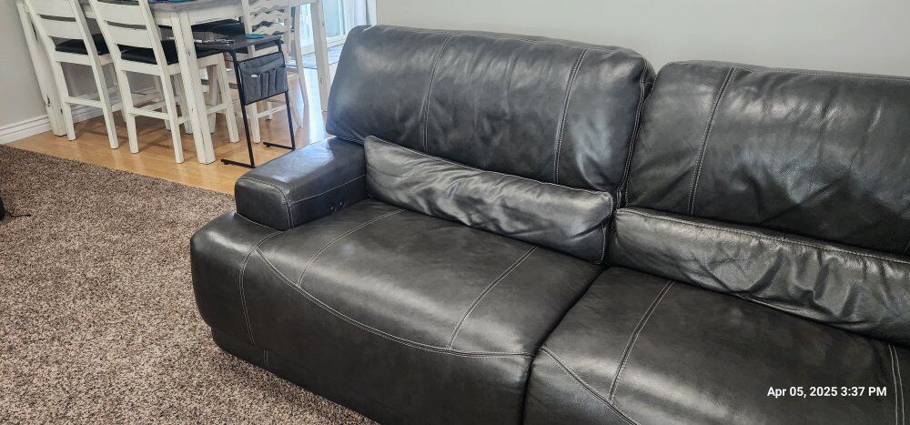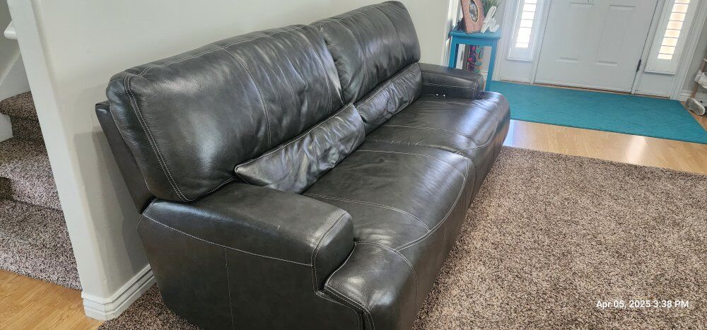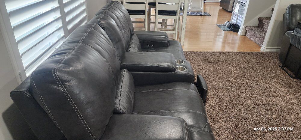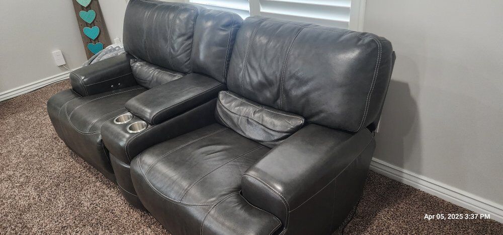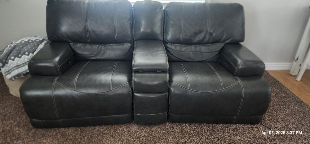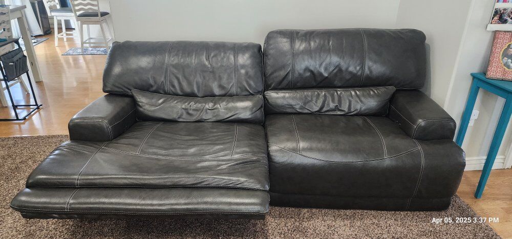 ZelleRecliner Leather Couches. These Couches are still in very good shape. both have 2 recliners that work great. dark Grey in color.