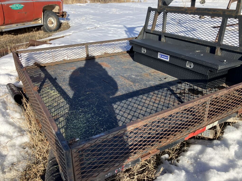8 foot by 8 foot truck bed. Has rack that goes over cab. Has hidden gooseneck ball. Has fold down sides. Heavy built and in pretty good shape. See phone number in pictures. Price is obo