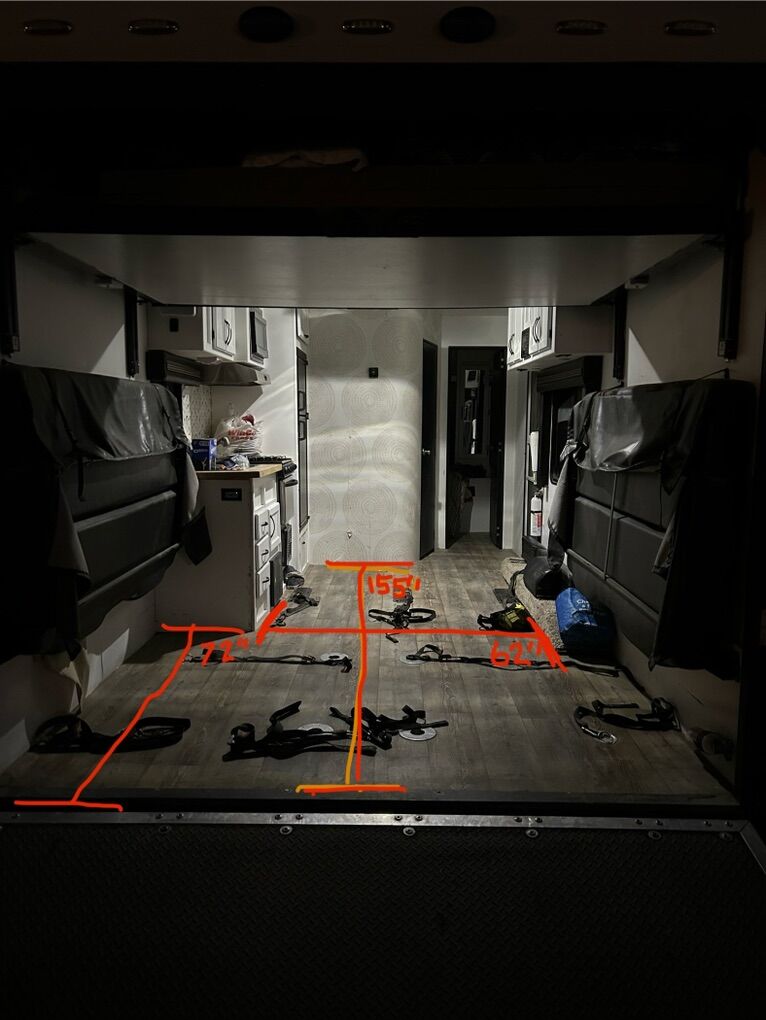 Garage size is roughly 13 feet deep, 64” wide, 79” tall under the bunk, bunk can be removed fairly easily by pulling out some pins that will give you a few more inches of height, sleeps 6. Comes with the stabilizer hitch