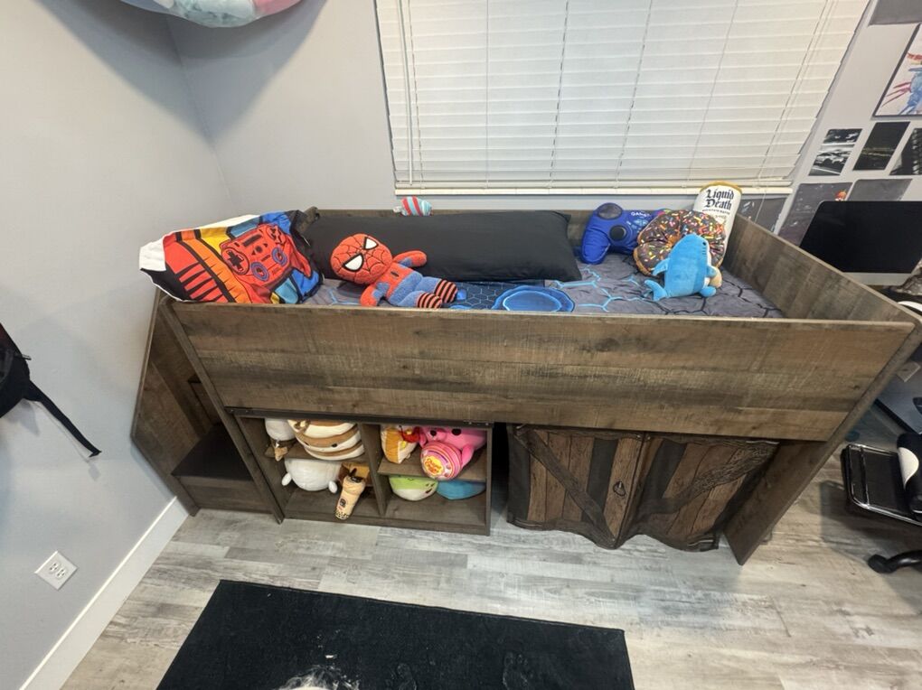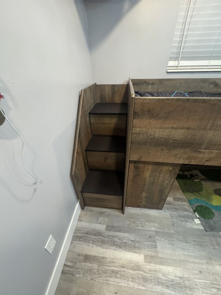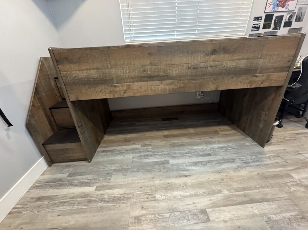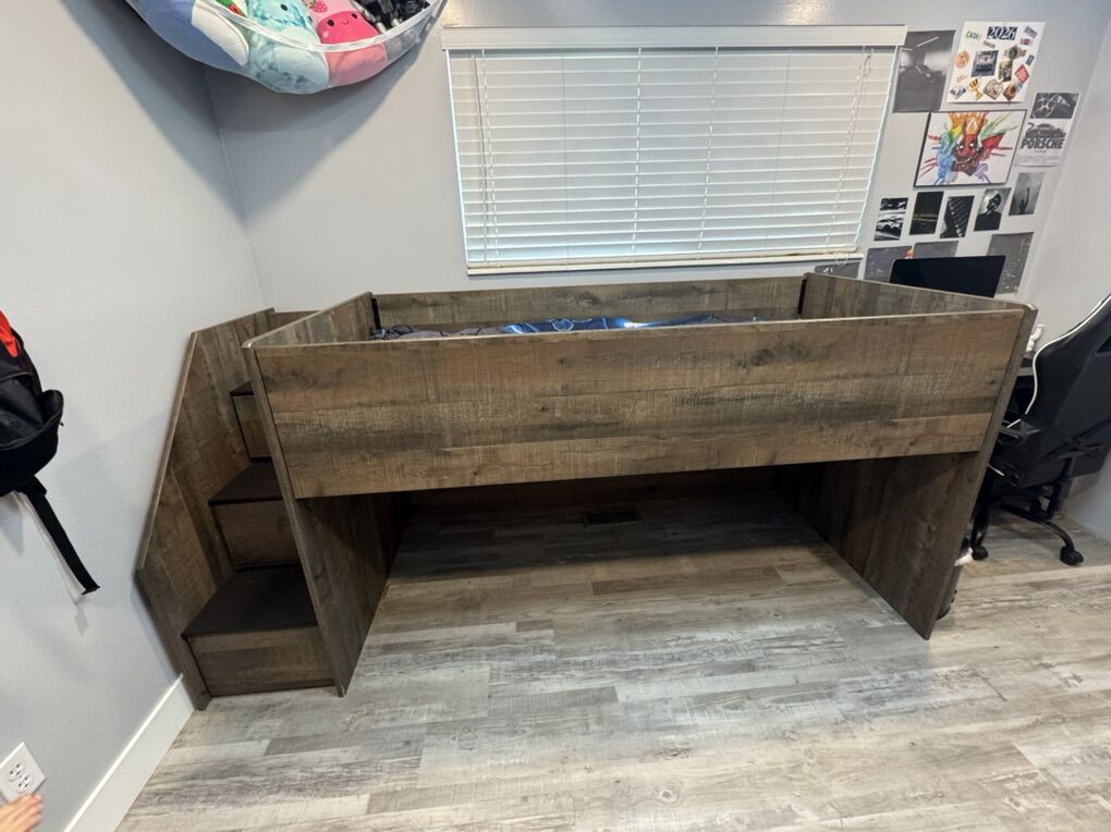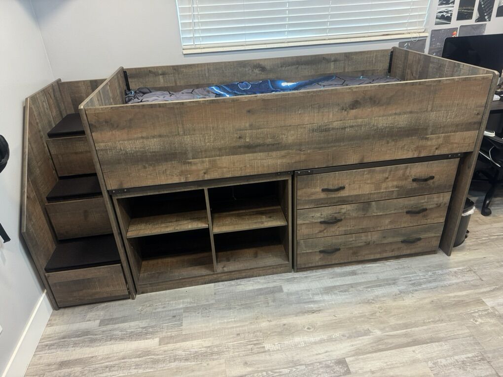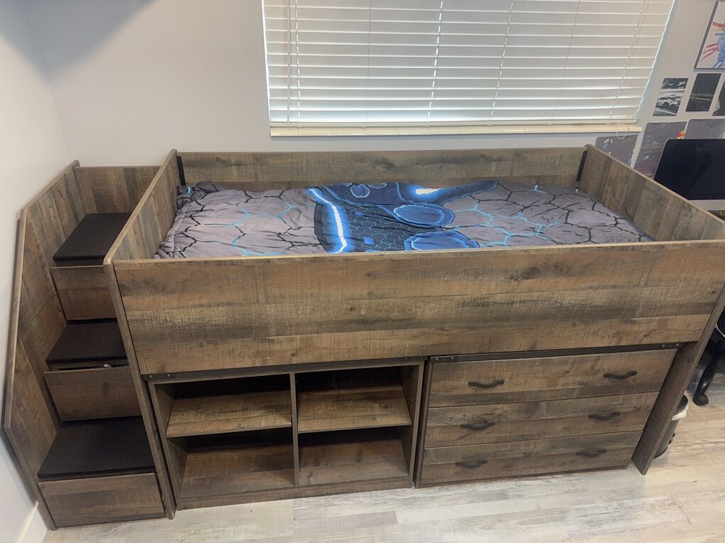 ApplePayBeautiful twin loft bed by Ashley Furniture, in great condition & perfect for maximizing space. Includes built-in bookcase and drawer storage for added functionality.