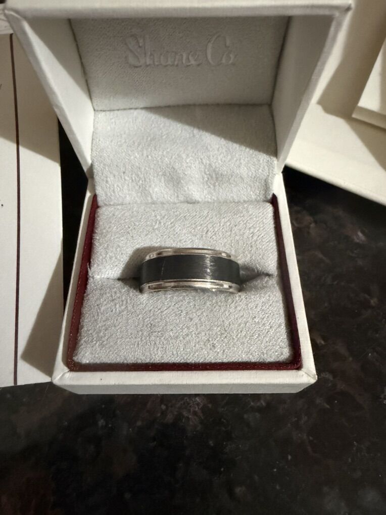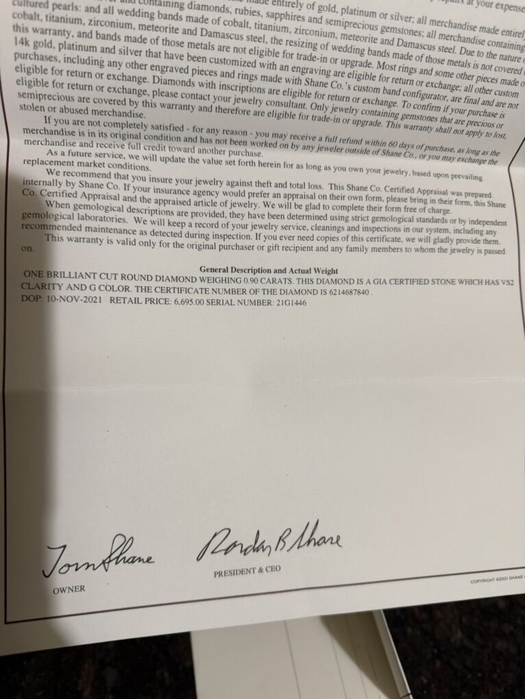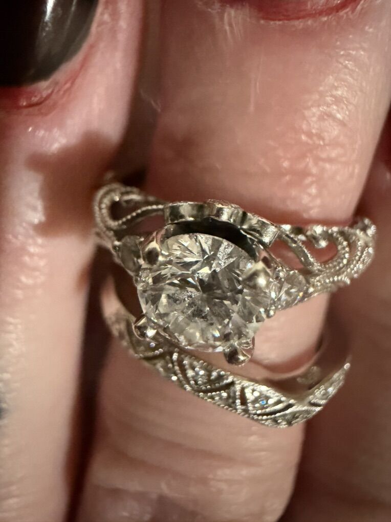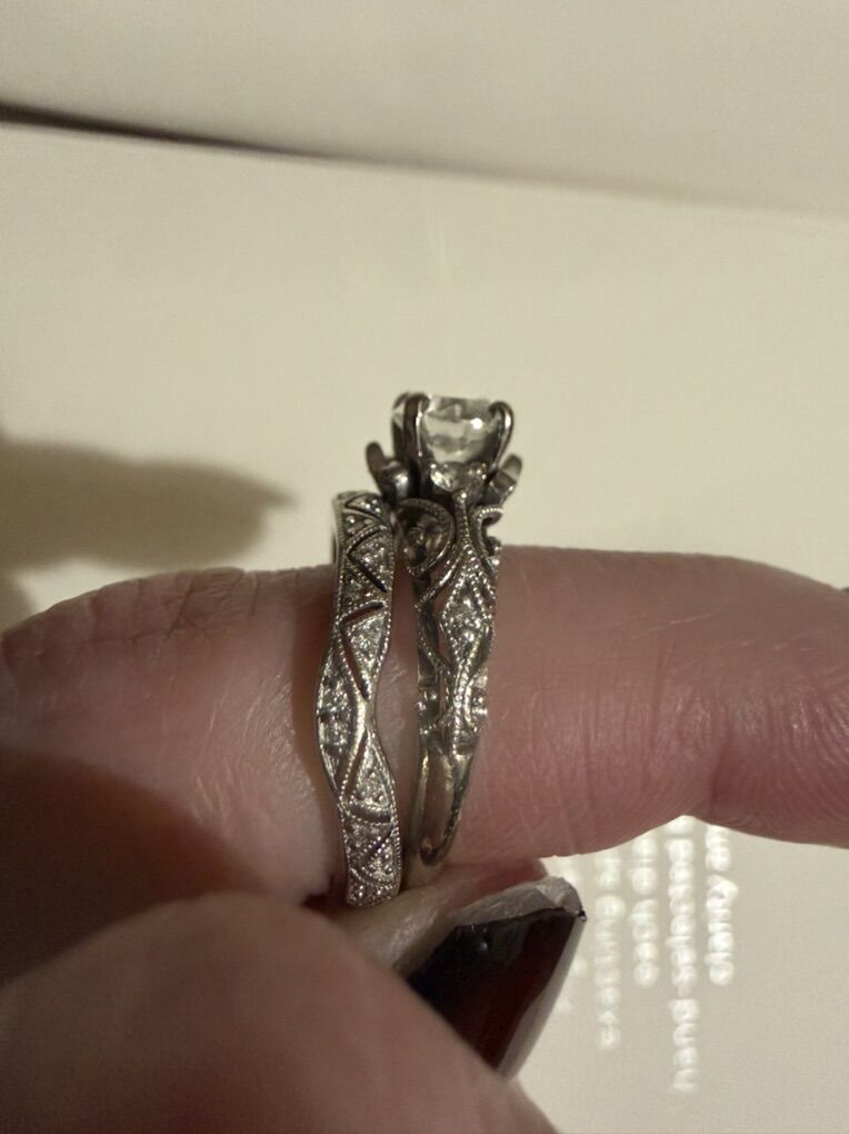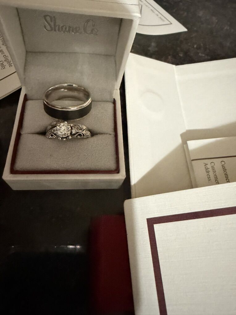 Wedding ring and engagement ring. The wedding ring is a .90 ct center stone. The side stones are .14 ct set in white gold. The band comes off and has .07ct diamond in white gold. The center stone is a natural diamond and is very beautiful. Size 6. The men’s band is white gold and tungsten, all purchased at the Shane company. All appraisal documents and receipts are available.