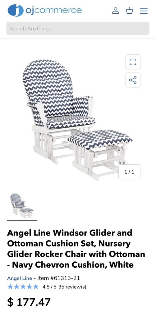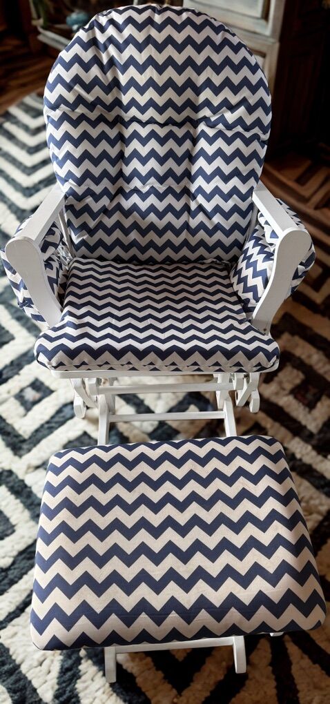 VenmoStylish glider chair and ottoman set. White wood frame has navy and white chevron pattern cushions. Super comfy for nursery or just chilling. Fcfs will deliver for a fee