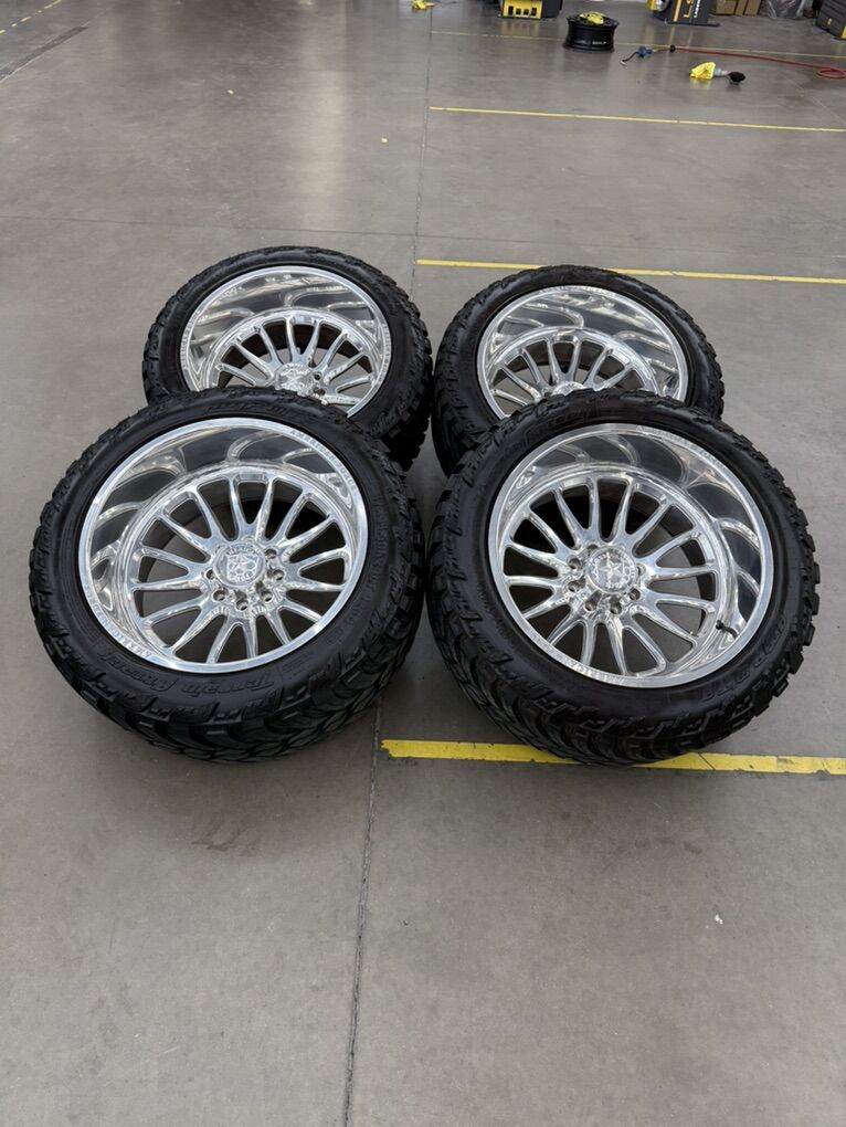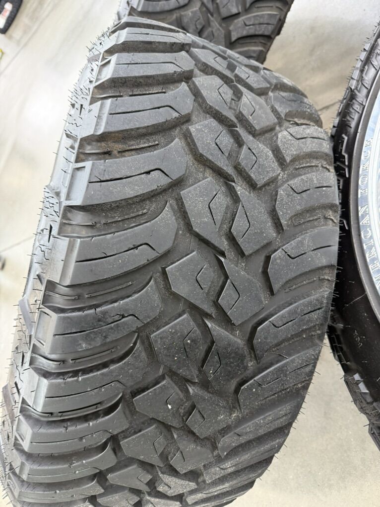Wheels are 24x14 American force nemesis, concave cut, -90mm offset, wheels are in perfect shape, no curb rash on them, wheels are in like new shape. Billet aluminum center caps are also included. Tires are 37x13.50r24 amp m/t, load range E, 10ply, top of the line tires