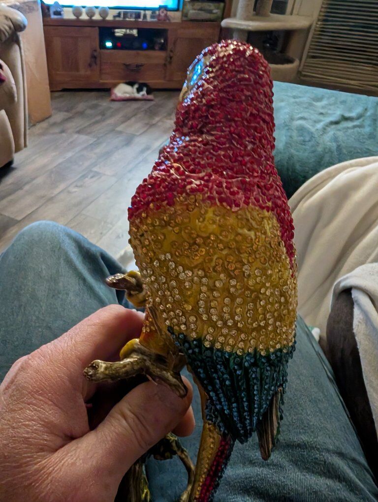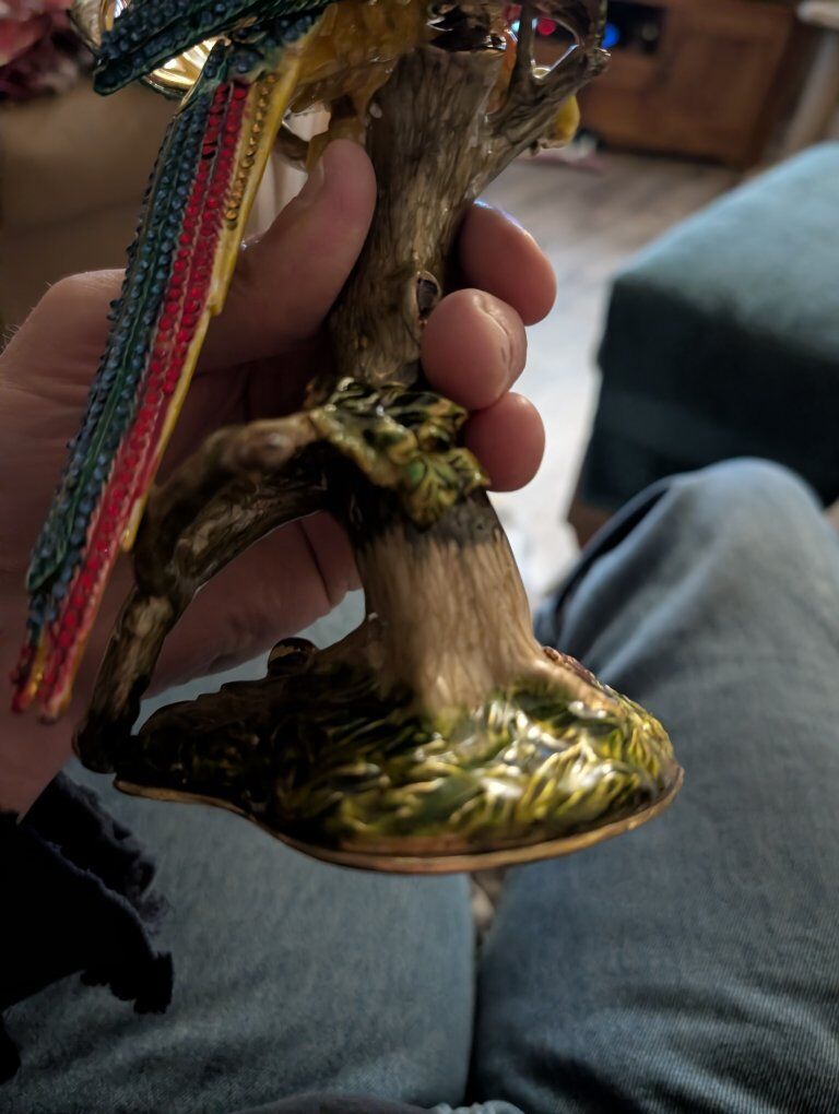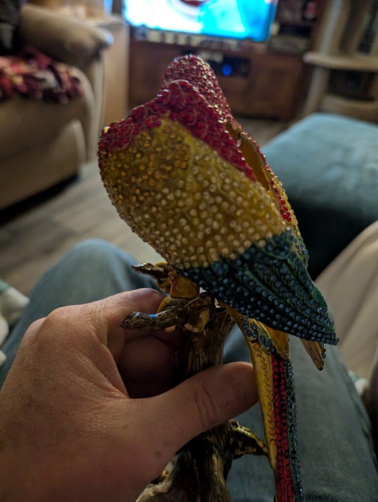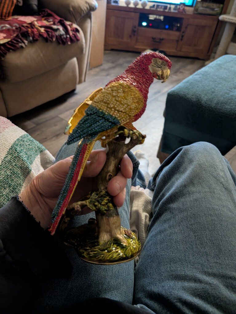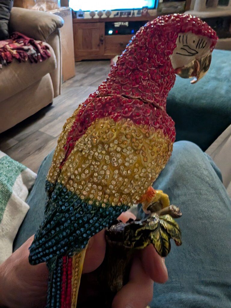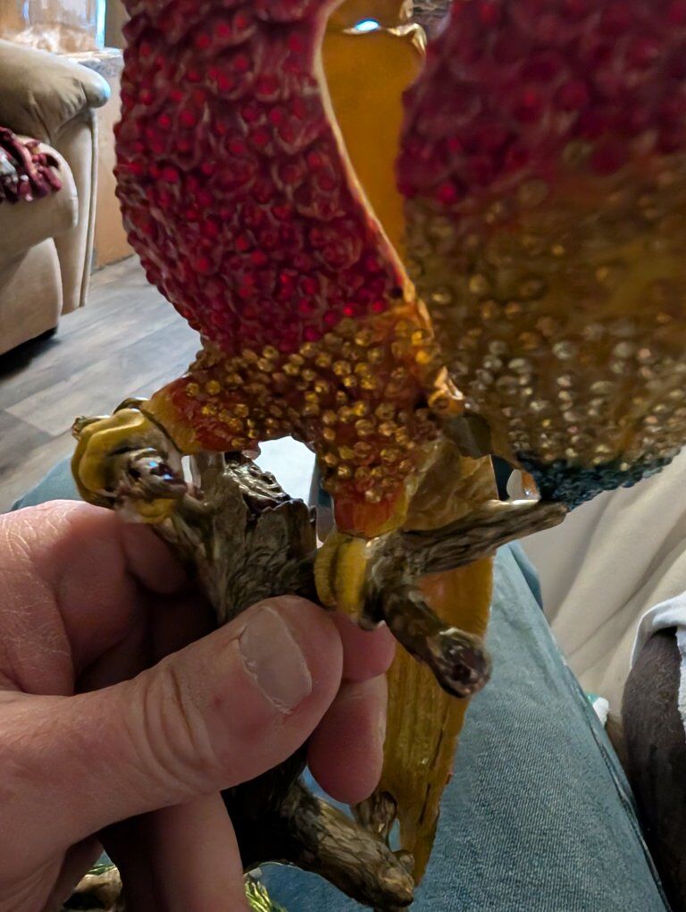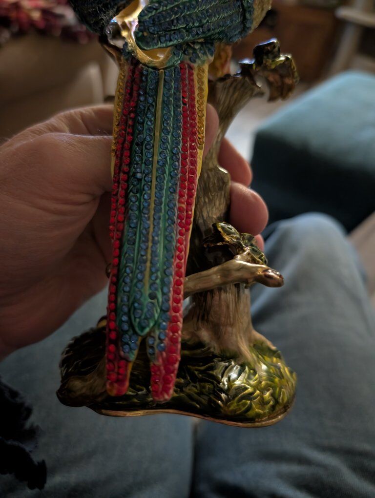 PayPalThe product is a beautiful parrot figurine with wings that open. This collectible item features a realistic design of a parrot, a popular bird species known for its vibrant colors and unique characteristics. Perfect for bird enthusiasts or collectors, this figurine adds a touch of elegance and charm to any space with its lifelike appearance and attention to detail.This item appears to be a collectible trinket box designed as a crystal-encrusted parrot figurine, specifically resembling luxury pieces from brands like Jay Strongwater or Keren Kopal. 200 or best offer. Will ship world wide.