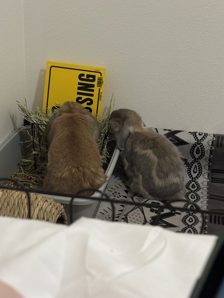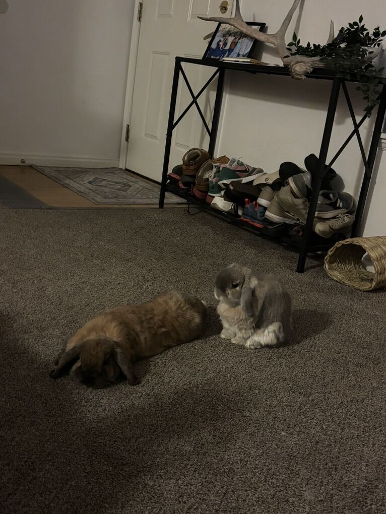 VenmoTwo bonded holland lop rabbits who need to be rehomed. Moving and can’t take them with me sadly. I love them so much and want them to go to a good home! Bonbon is the gray one he’s four years old and moose is the brown one he’s one years old. Both neutered and bonded together. Will come with a cage, carpet, carrier, toys, treats, some pellets, some hay, and some litter, also comes with litter box and hay holder!