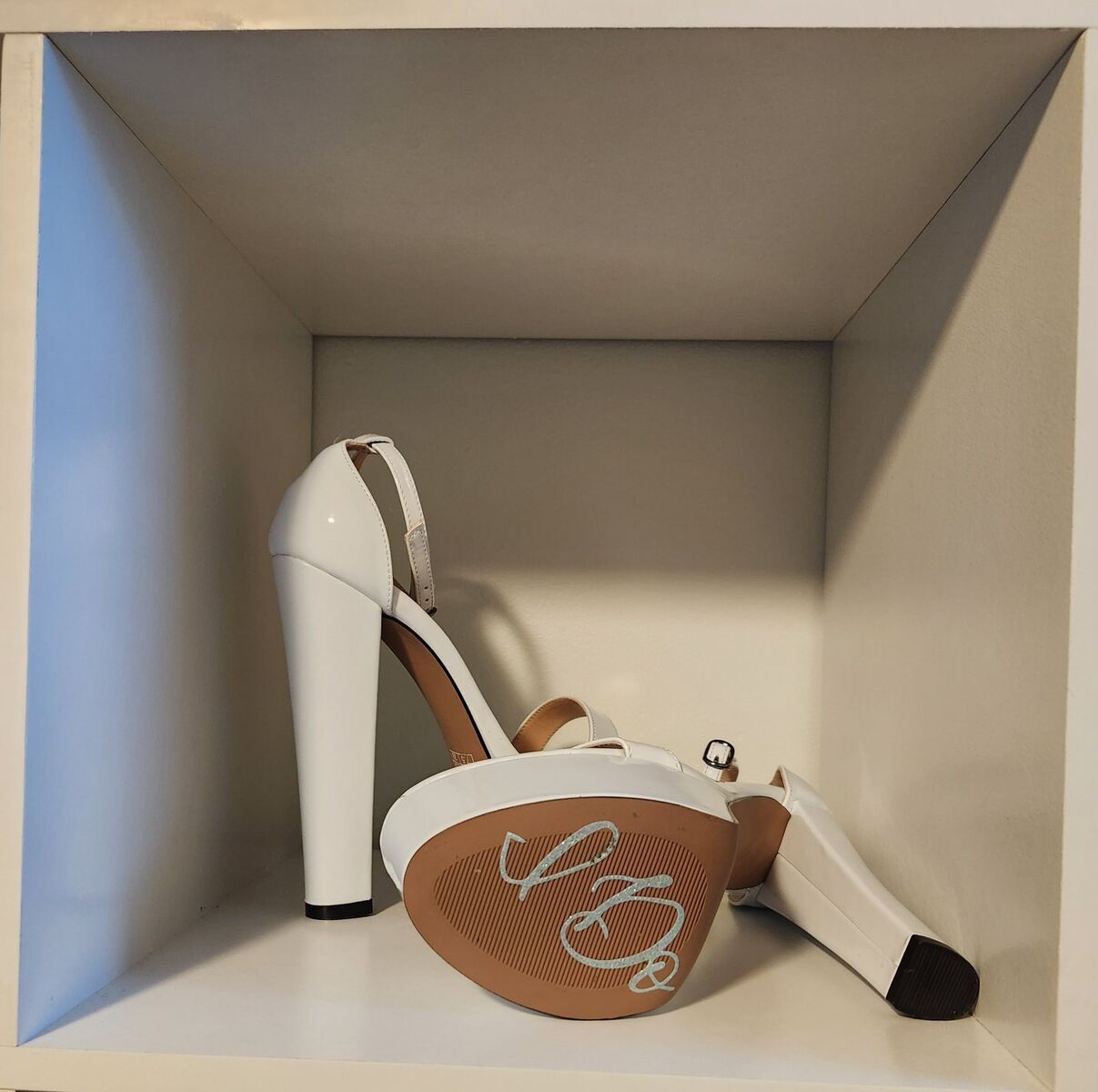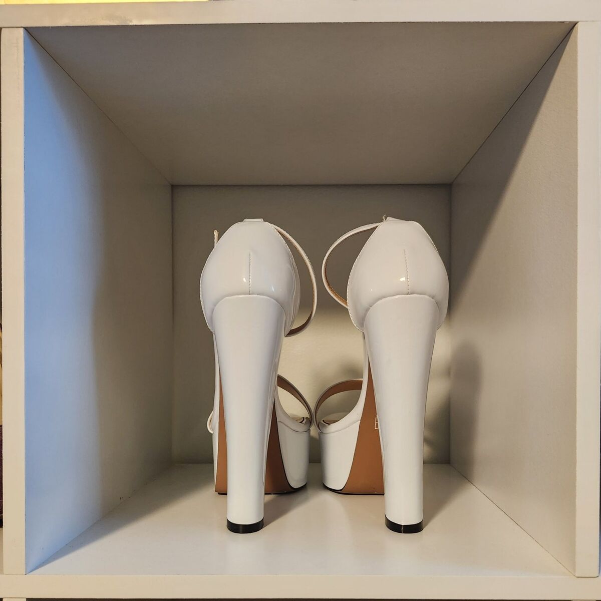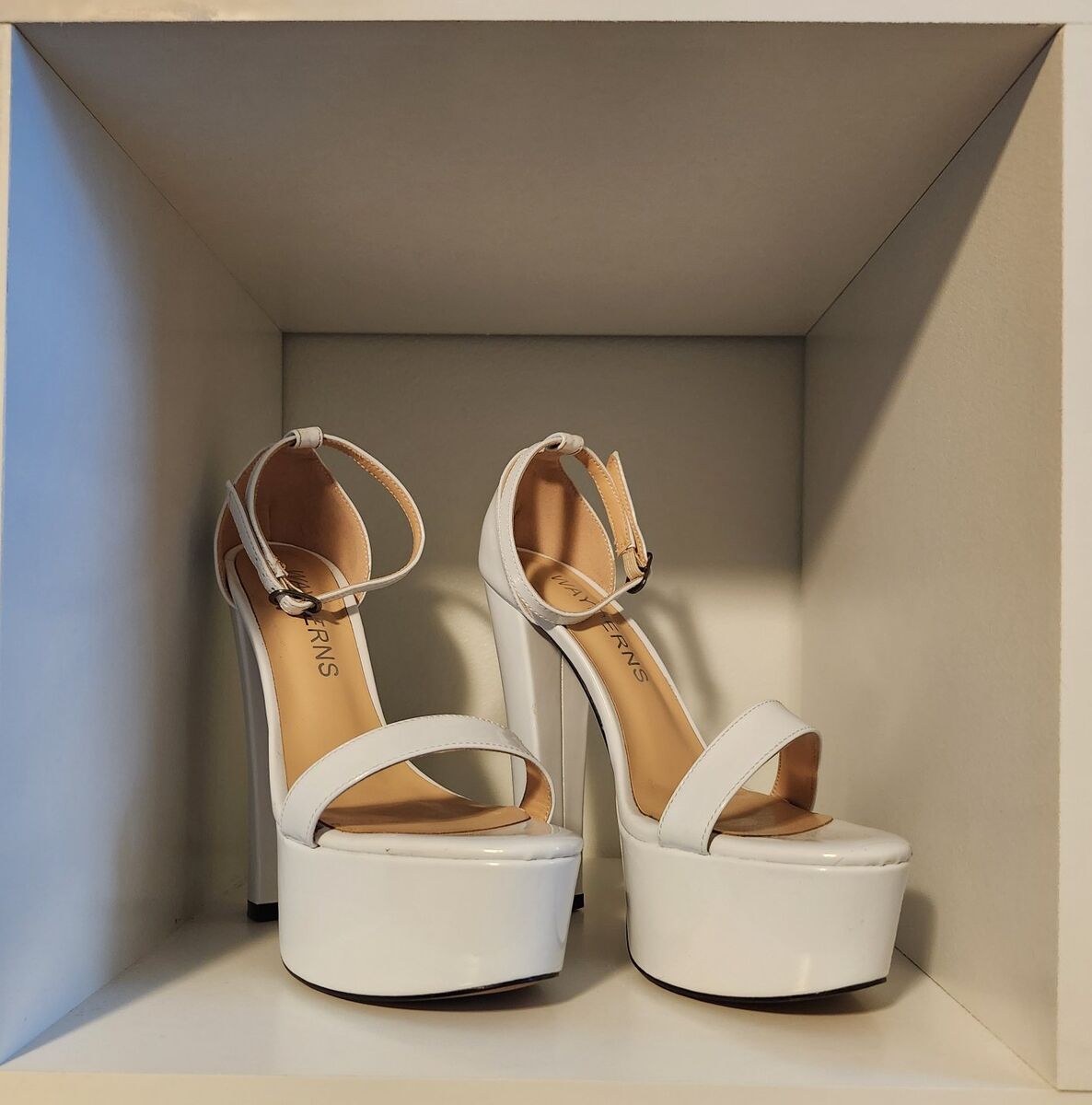 VenmoWAYDERNS women’s white platform heels with ankle strap and buckle. Size 7.5, open toe, patent finish and 6-inch block heel. Purchased on Amazon for $70 and worn once for my wedding. Elegant, sturdy and great for weddings, formal events, photo shoots or special occasions. In excellent condition. Has sparkly "I Do" under one heel (something blue). Smoke-free home.