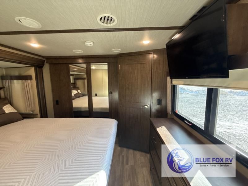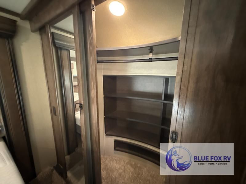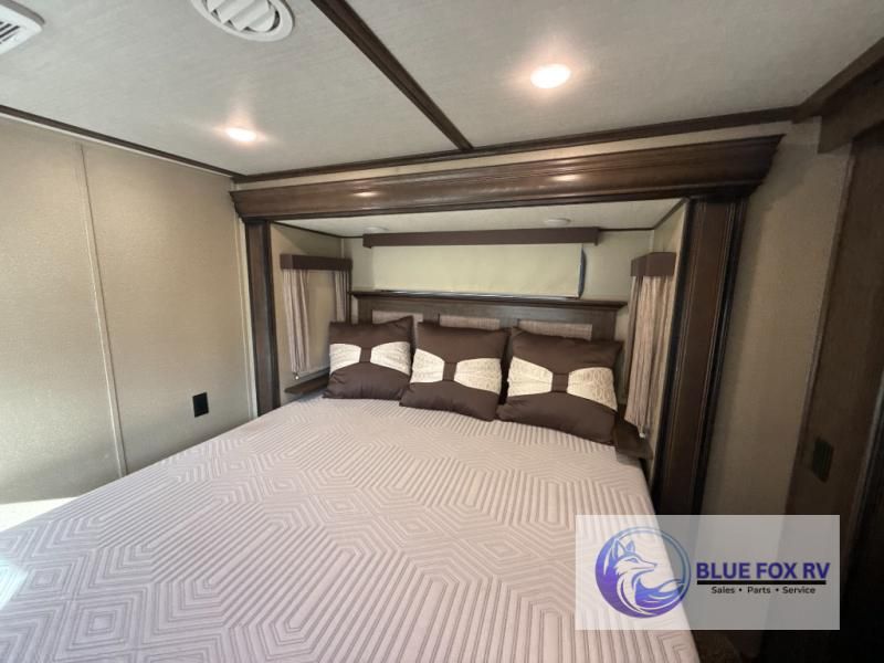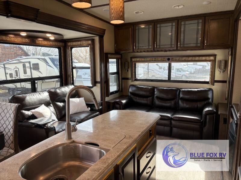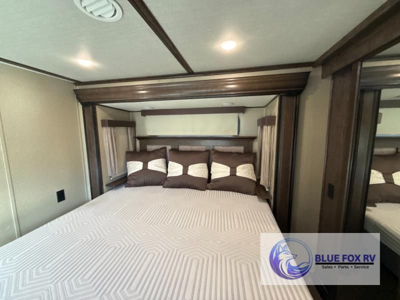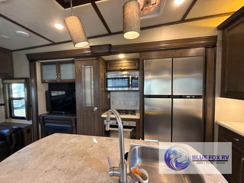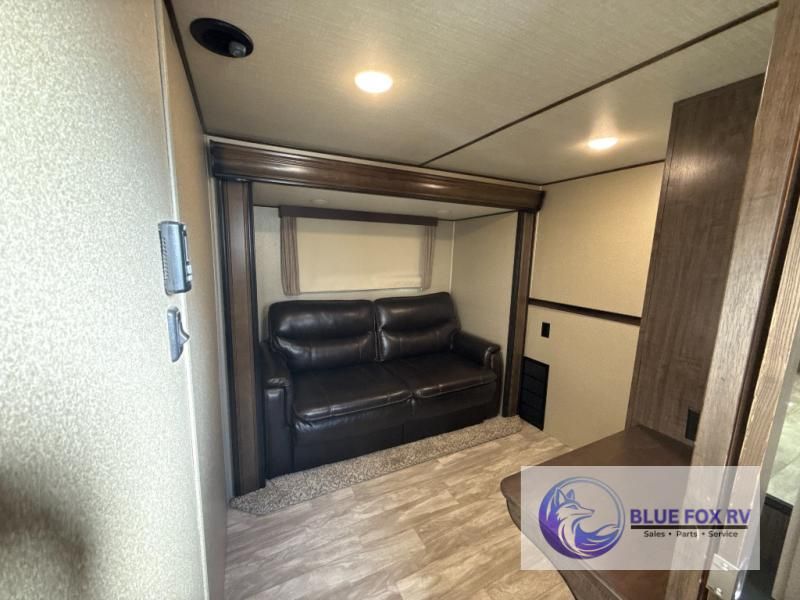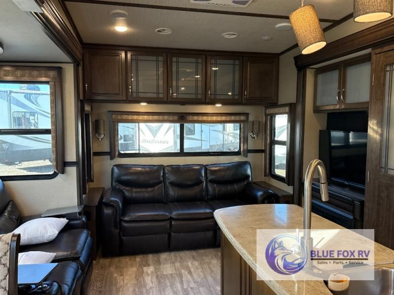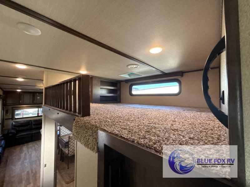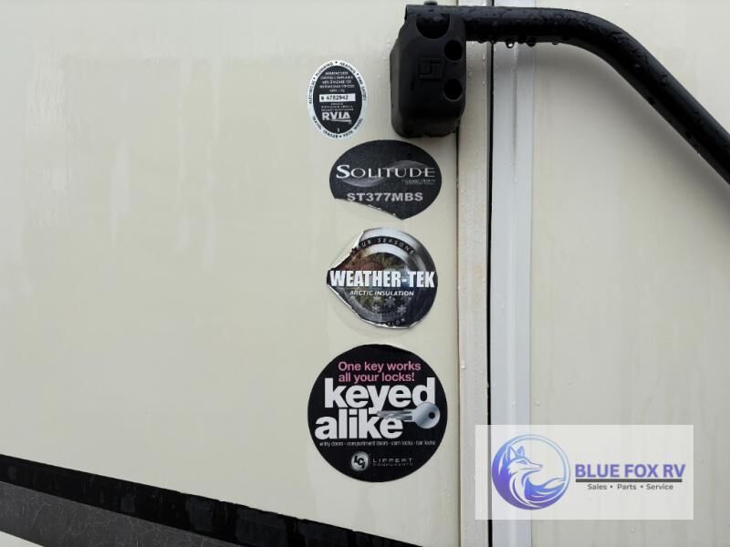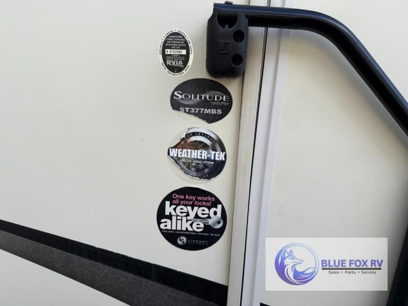If you have been searching for a fifth wheel with an extra living room that can be utilized as an office or even a bedroom then look no further, this Solitude 377MBS fifth wheel may complete your checklist. The extra living room provides a desk, storage, and a seating area, plus a loft above for even more sleeping space. The front master bedroom provides the perfect bedding, storage for all your clothing, and a TV, plus more! The cook will surely love making meals with the professional grade stainless steel cooktop, built-in oven and convection microwave. The popular kitchen island, stainless steel 18 cu. ft. four door refrigerator, and large pantry allow you to stock up on food and wash dishes while visiting with your guests. The buffet adds additional counter space to serve food or place your keys and things. You might even decide to add a few options such as a washer and dryer to keep your clothes clean the whole time, a king size bed for more sleeping surface, or even a pull-out kitchen to make meals outdoors. There are many features and plenty of space for everyone!