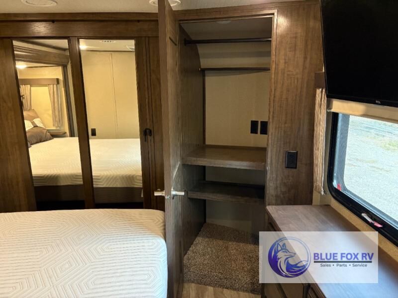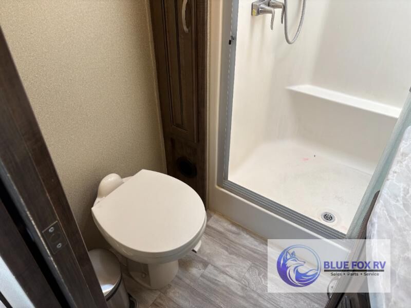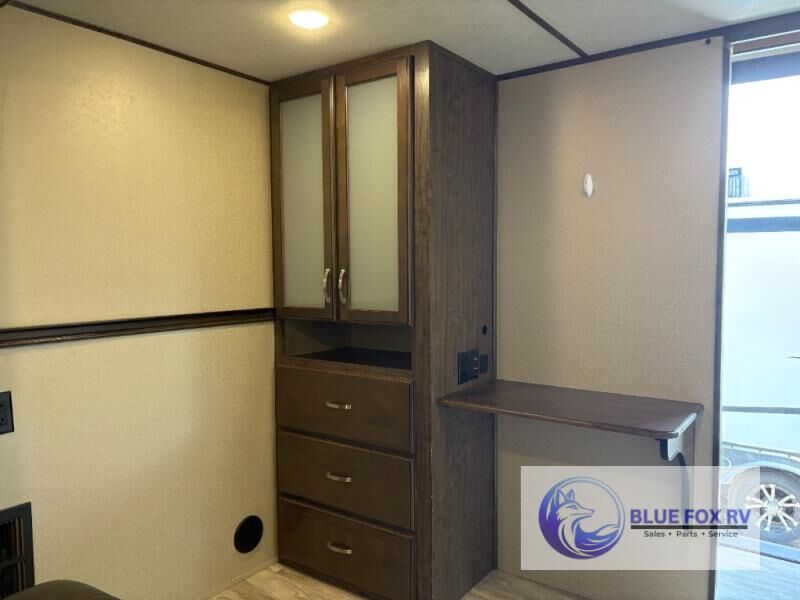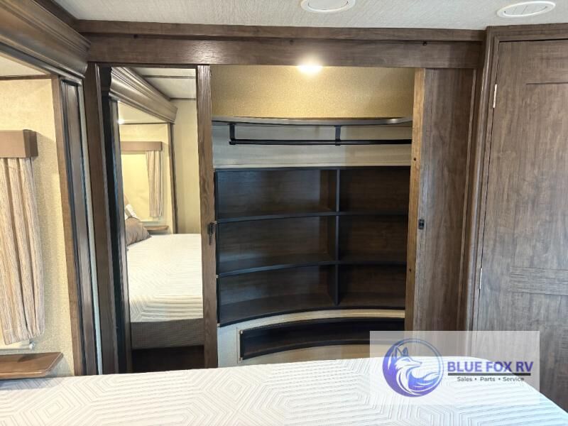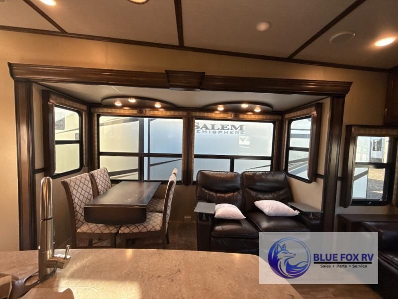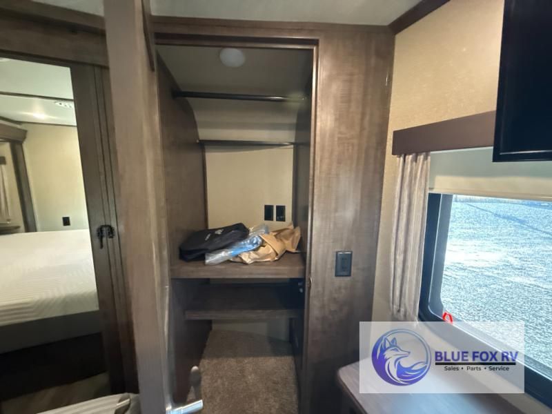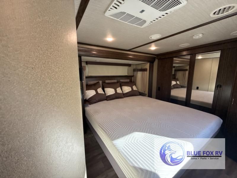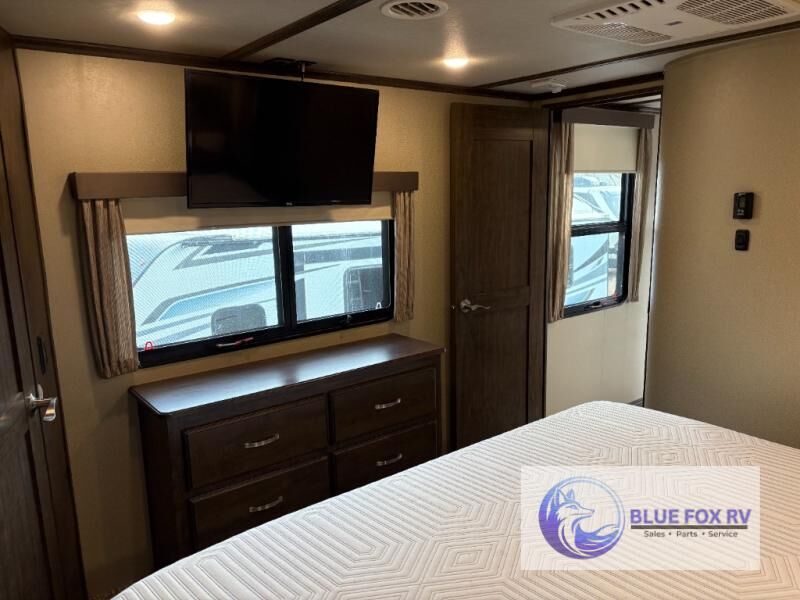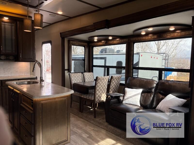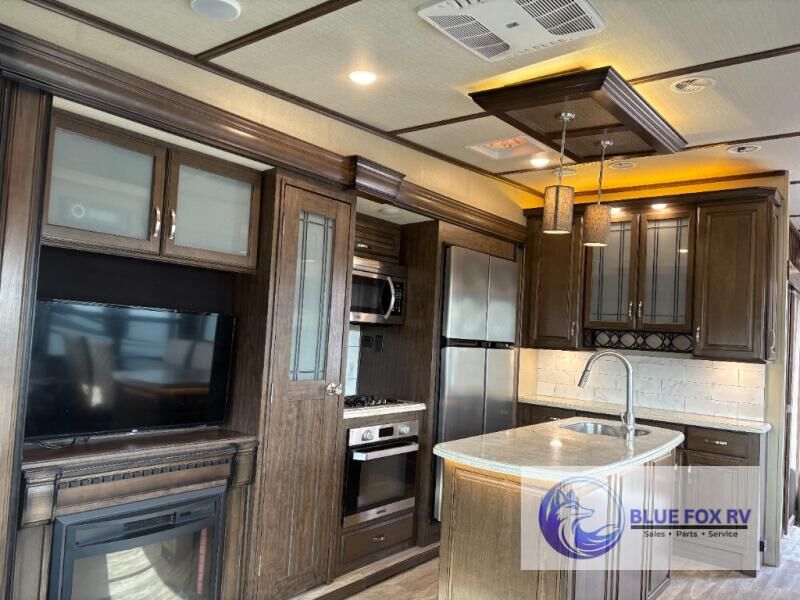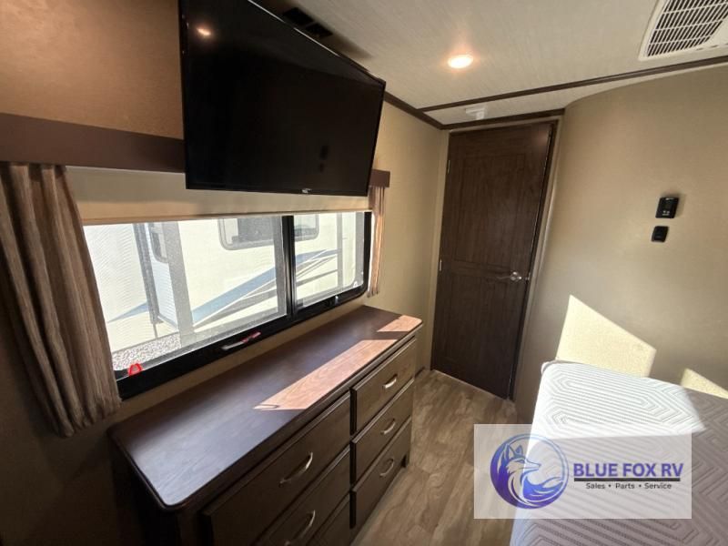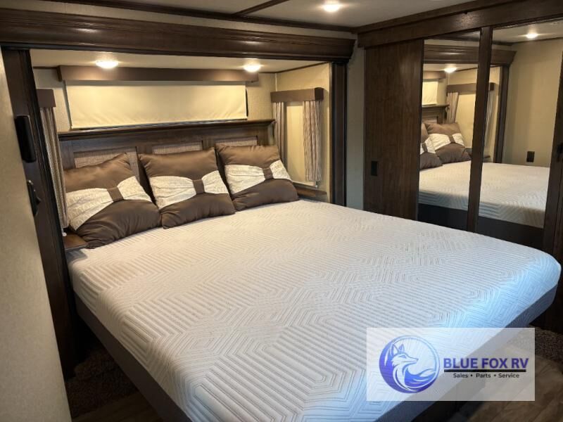 If you have been searching for a fifth wheel with an extra living room that can be utilized as an office or even a bedroom then look no further, this Solitude 377MBS fifth wheel may complete your checklist. The extra living room provides a desk, storage, and a seating area, plus a loft above for even more sleeping space. The front master bedroom provides the perfect bedding, storage for all your clothing, and a TV, plus more! The cook will surely love making meals with the professional grade stainless steel cooktop, built-in oven and convection microwave. The popular kitchen island, stainless steel 18 cu. ft. four door refrigerator, and large pantry allow you to stock up on food and wash dishes while visiting with your guests. The buffet adds additional counter space to serve food or place your keys and things. You might even decide to add a few options such as a washer and dryer to keep your clothes clean the whole time, a king size bed for more sleeping surface, or even a pull-out kitchen to make meals outdoors. There are many features and plenty of space for everyone!