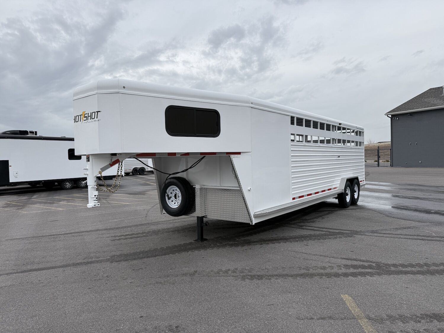 The Trails West Hot Shot gooseneck trailer is a 7’6″ wide x 7’ tall livestock trailer. The design of this trailer has electro-galvanized seamless corrugated steel sides for strength and durability. This extra-safe stock trailer is light weight and built for safety. This is a great pulling trailer because of the aerodynamic design of the front, cutting the wind while still providing enough space in the gooseneck area for an optional tack package. Check out this great priced trailer that is built for real stock men and women.