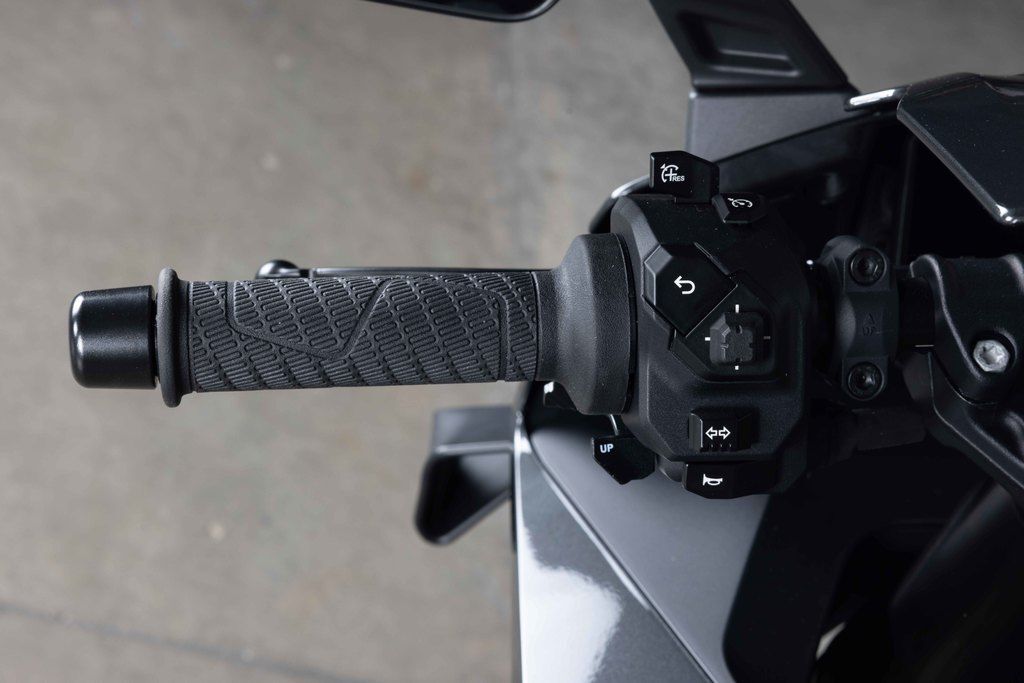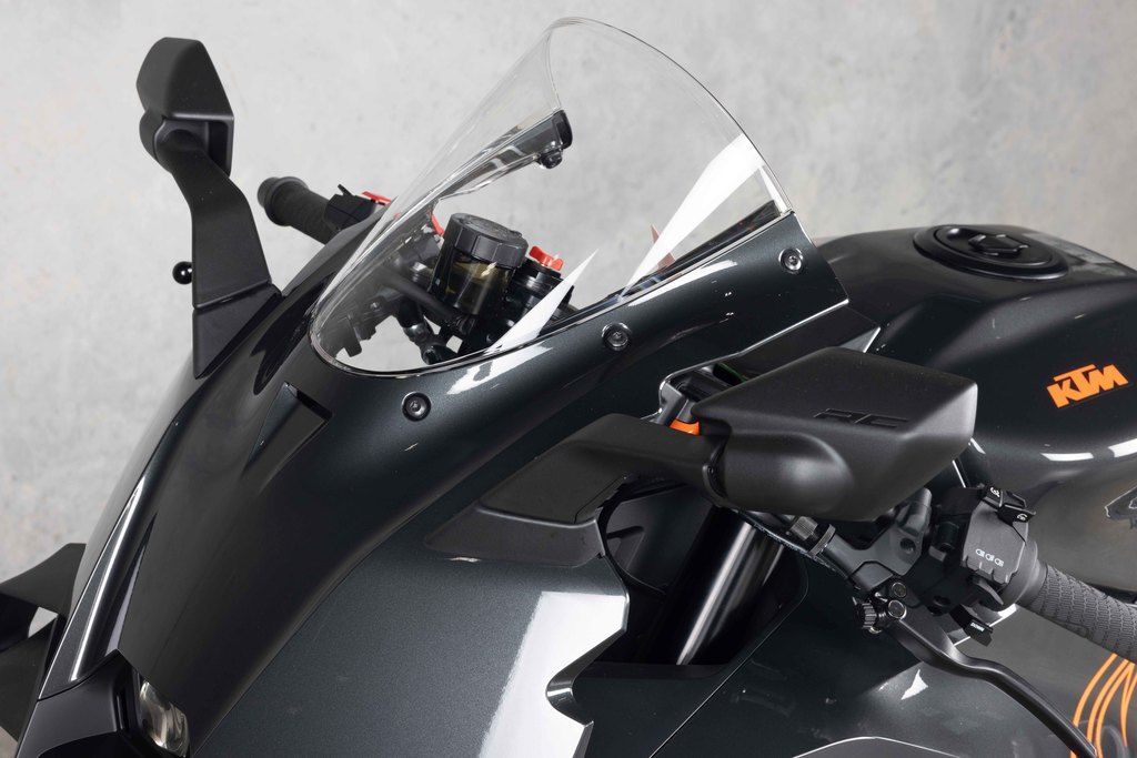 The KTM 990 RC R's ergonomics are standout. To ensure that the rider is integrated in a way to grapple the Supersport DNA of the bike without compromising day-to-day comfort and practicality, KTM has fashioned a tank shape with 6 contact points. The form of the product will suit a wide range of heights and permits the rider to 'glide' around the motorcycle while still being able to exert control through legs, knees and arms. The KTM 990 RC R has aluminum clip-on handlebars, adjustable levers and adjustable footpegs: the standard 'street' setting can be moved 25 mm back and 17 mm higher for a more racing 'track' poise and more influence for full lean angles.