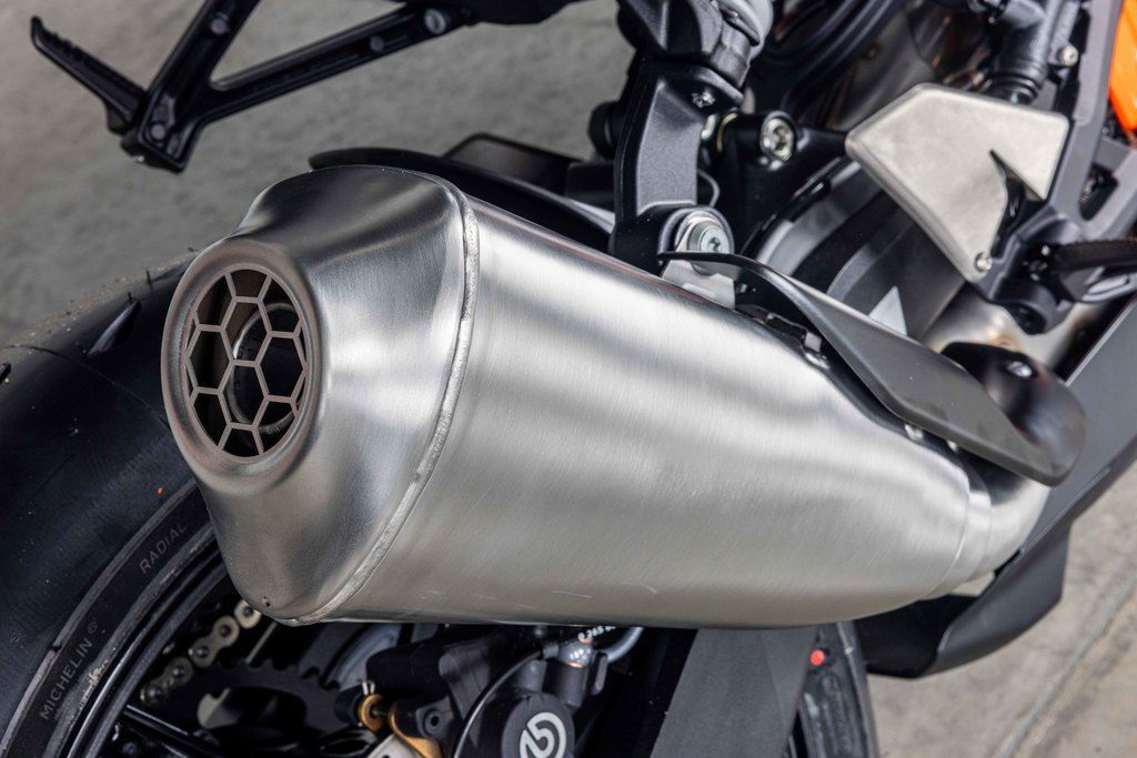 The 947 cc, parallel twin LC8c has been harnessed even further thanks to a tweaked engine map and 100% full throttle opening position to suit the needs of the KTM 990 RC R and the most compact twin in the segment. The impressive engine breathes through a new stainless steel, centralized exhaust muffler, which also helps to urge the whole show to gobble straights and slice corners.