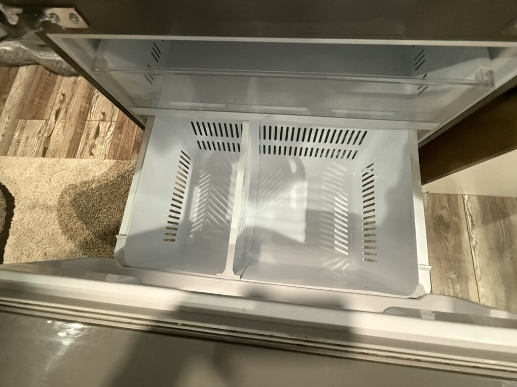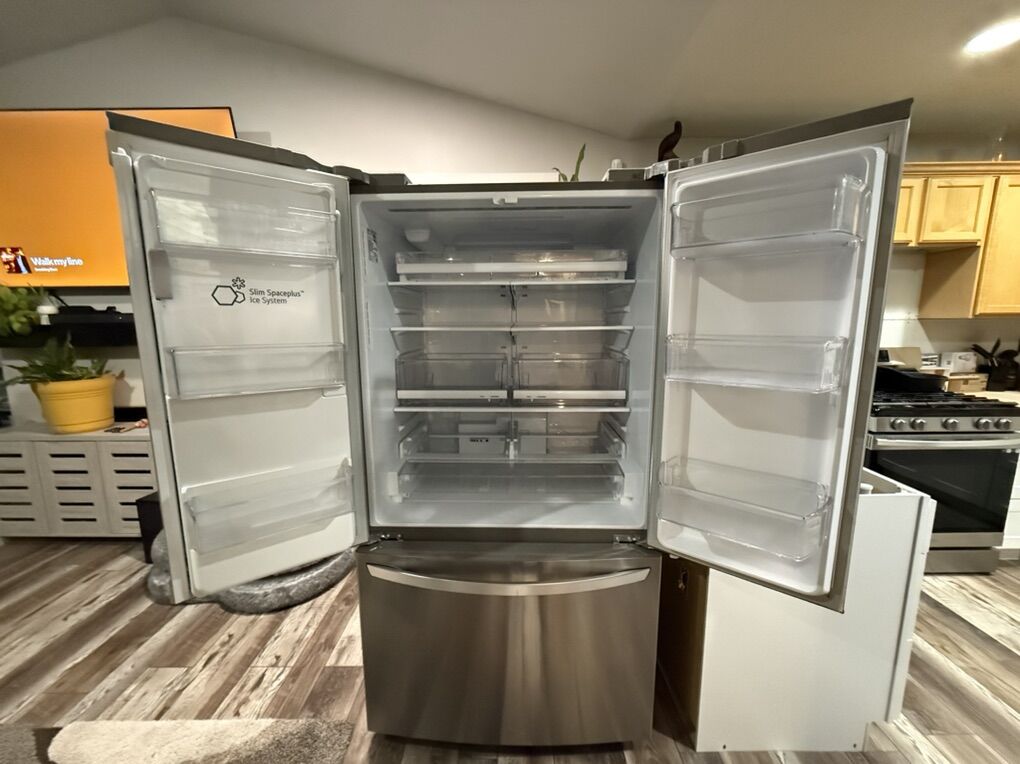 ApplePaySleek LG French door refrigerator. Stainless steel finish with bottom freezer. Has external ice and water dispenser. Comes with ThinQ smart tech and Slim Spaceplus Ice System. Inside is super clean, all shelves and drawers are included.