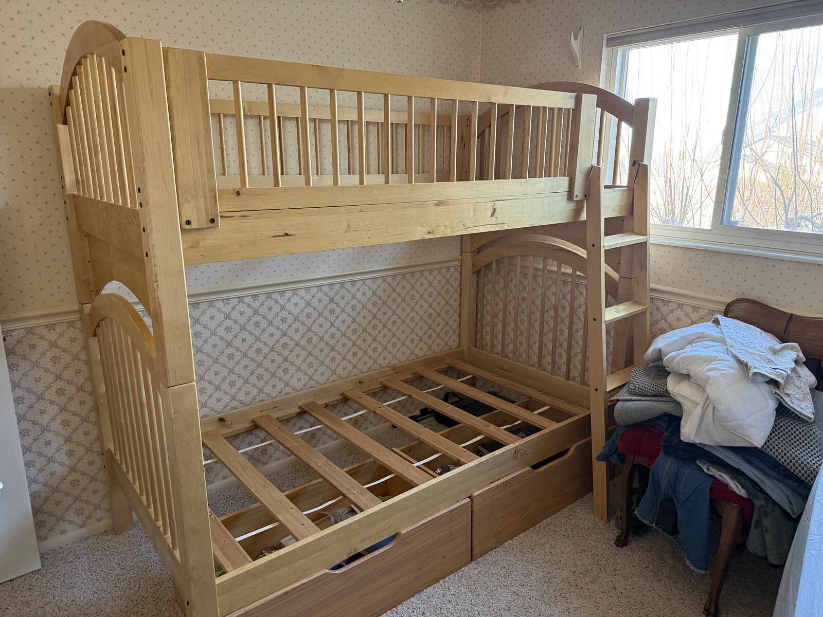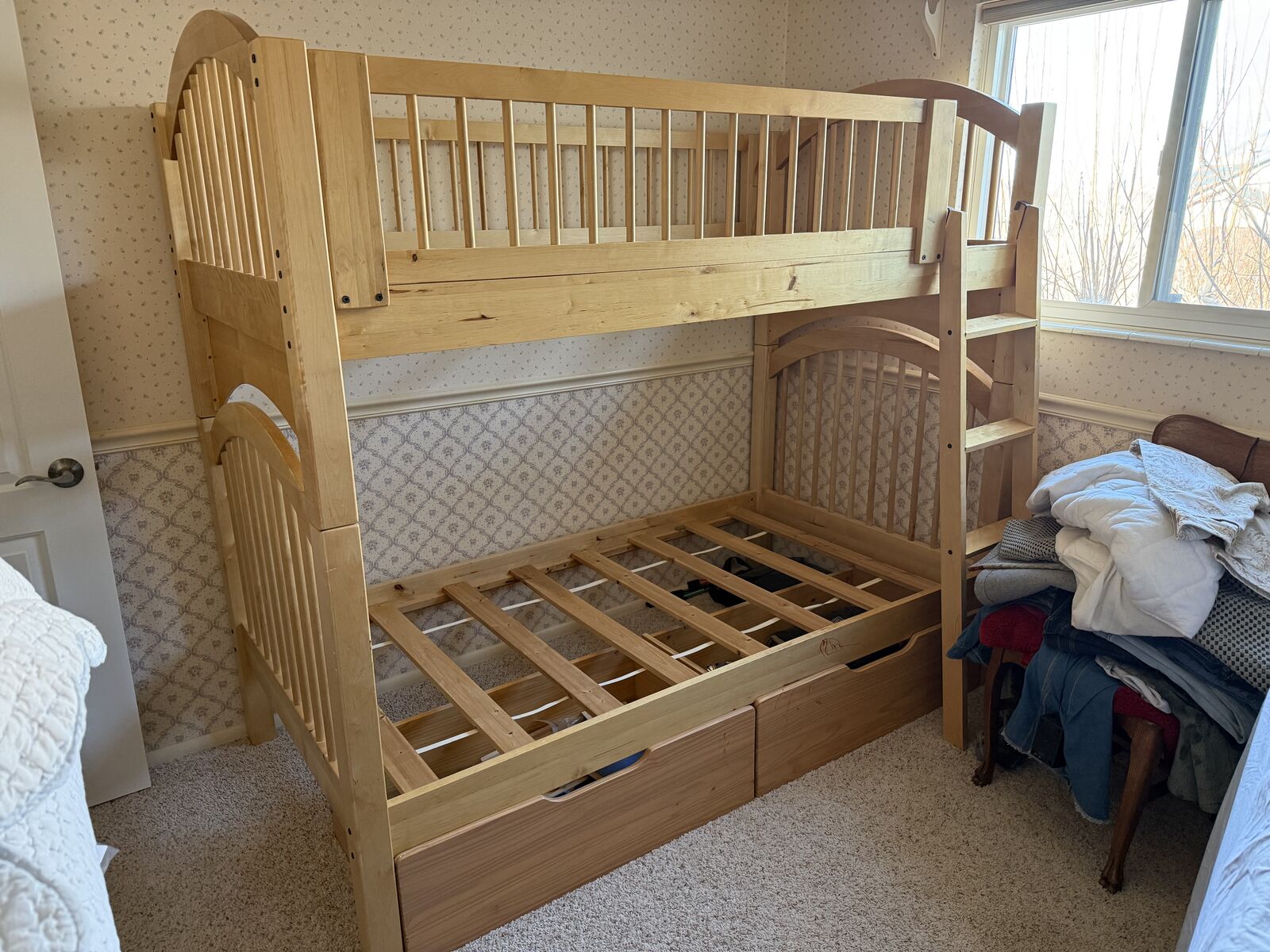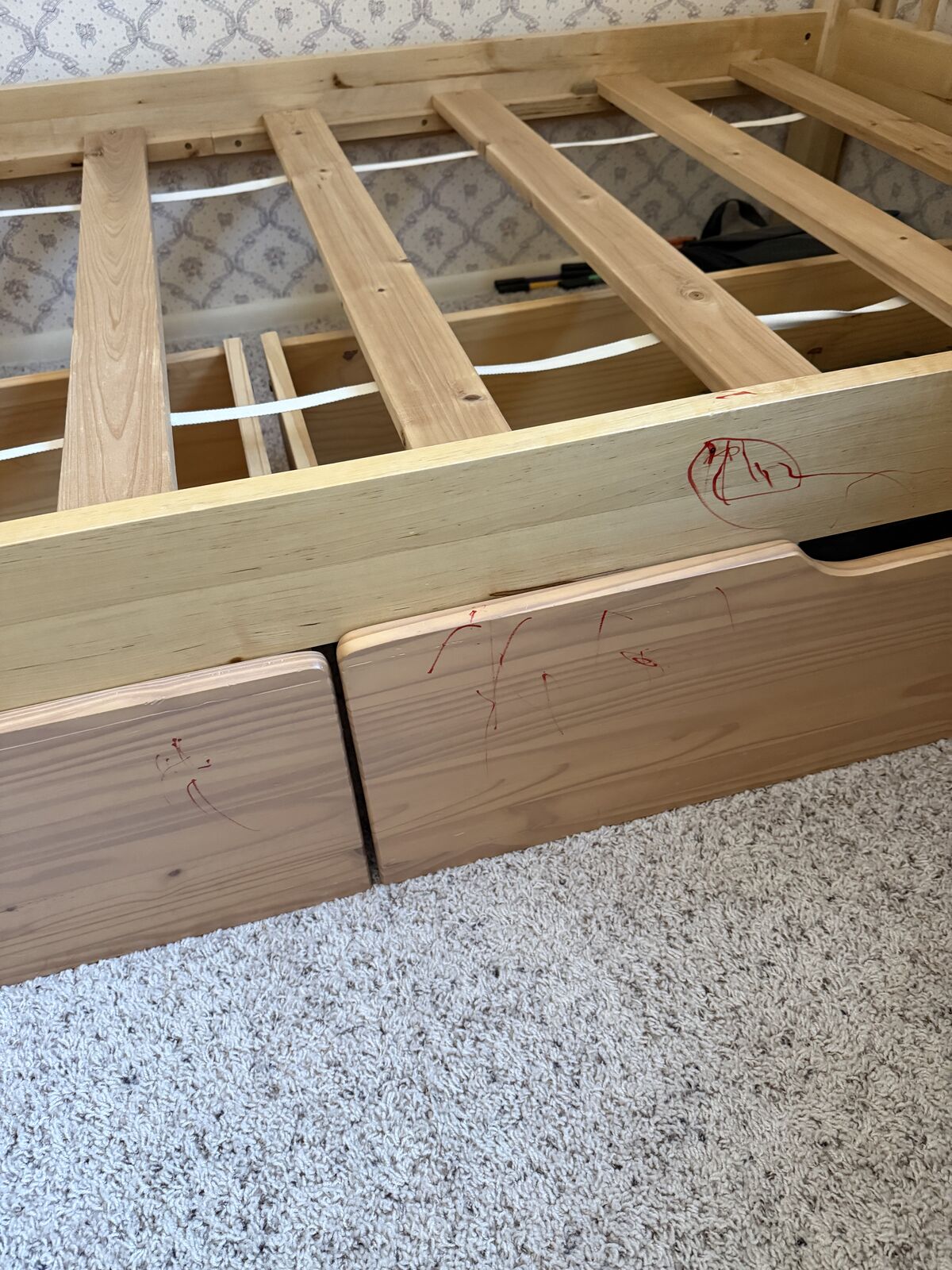 This is a sturdy solid wood twin bunk bed that has safety rail around top bunk ladder and under bed storage. It's made of pine. Can also be set up as 2 separate beds. In great condition red marker has been removed off of base with magic eraser.