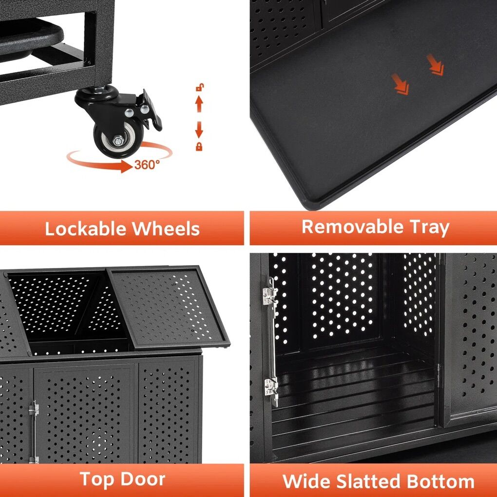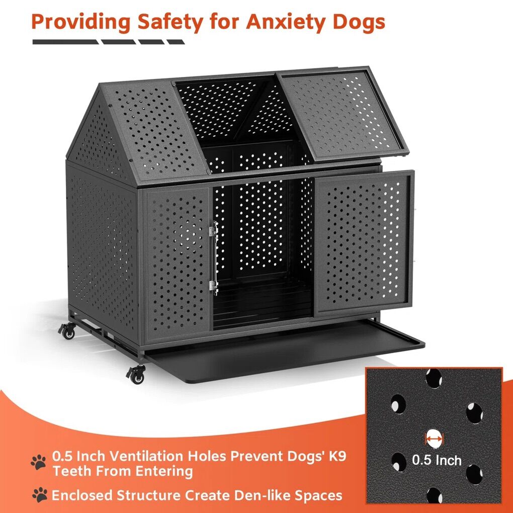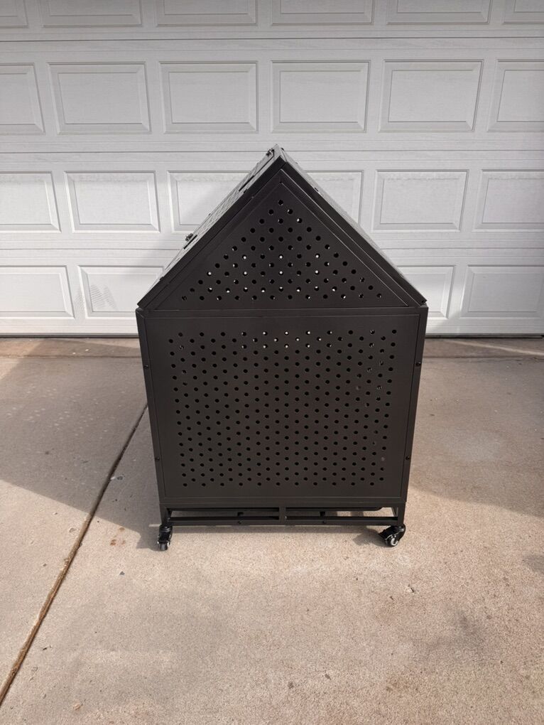 Heavy-duty enclosed metal kennel/crate with a pointed “house” roof and ventilated side panels—works great as a secure indoor dog crate, chicken isolation/temporary shelter, or other short-term animal housing. Approx. overall dimensions: 43.3” wide x 29.5” deep x 43.6” tall.