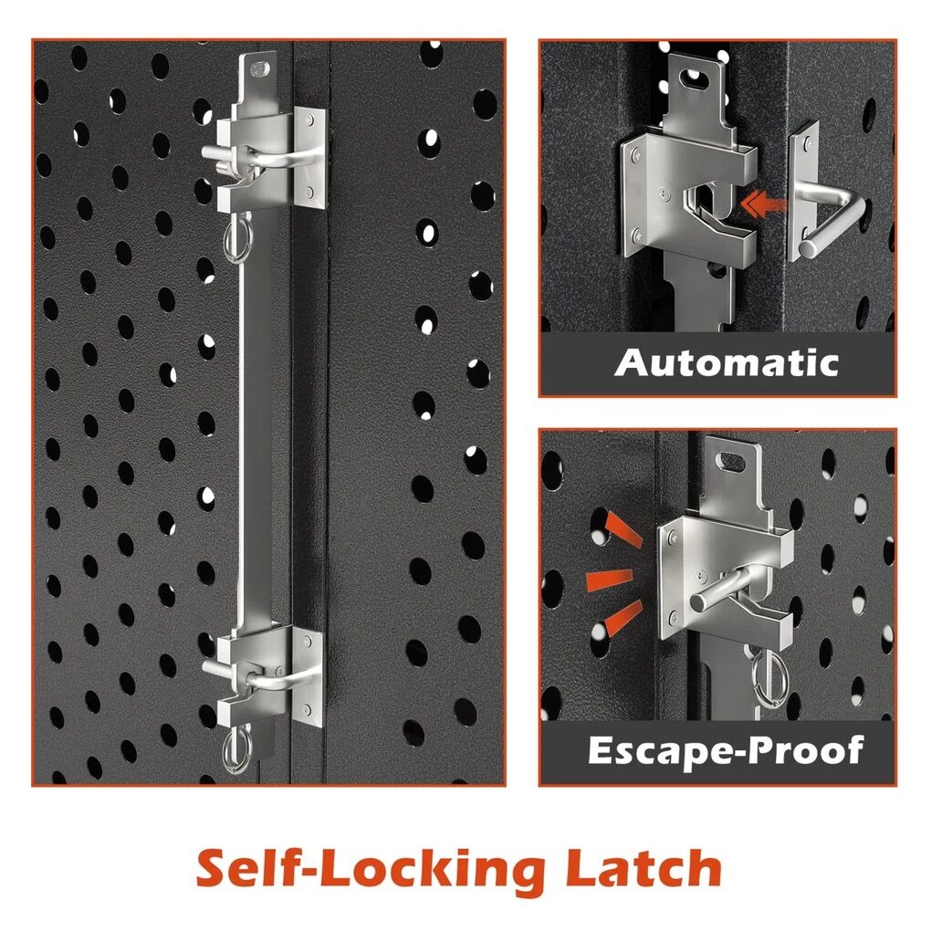 Features include a self-locking latch, ventilated panels (small holes), and a removable/washable plastic tray/pan for easier cleaning.