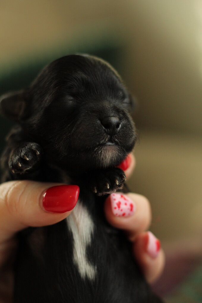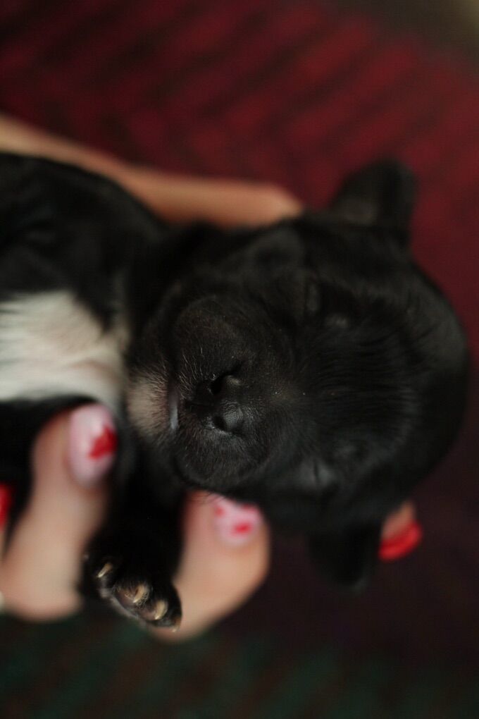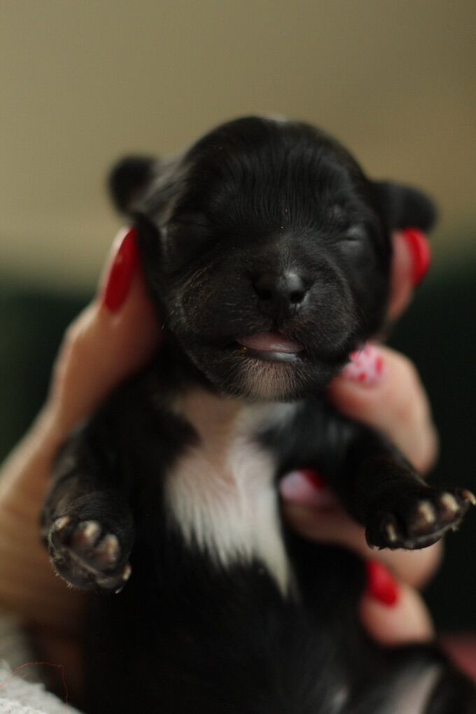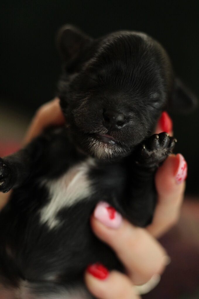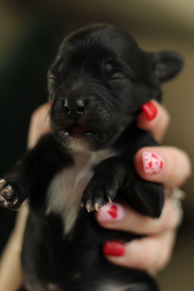 Our bigger, stockier boy with the sweetest expression. He has a gorgeous black coat accented with bright white on his chest and even on his back toes — giving him that extra charm. He’s sturdy, cuddly, and built like a little plush bear. If you love a confident, affectionate pup with a little more substance, Chunky Chip is your guy.