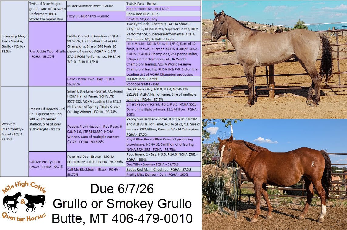 Bred to Silverking Magic Two for an early June foal. Guaranteed Grullo. Full sibling pictured, we are retaining her as a replacement, so offering the dam for a limited time.