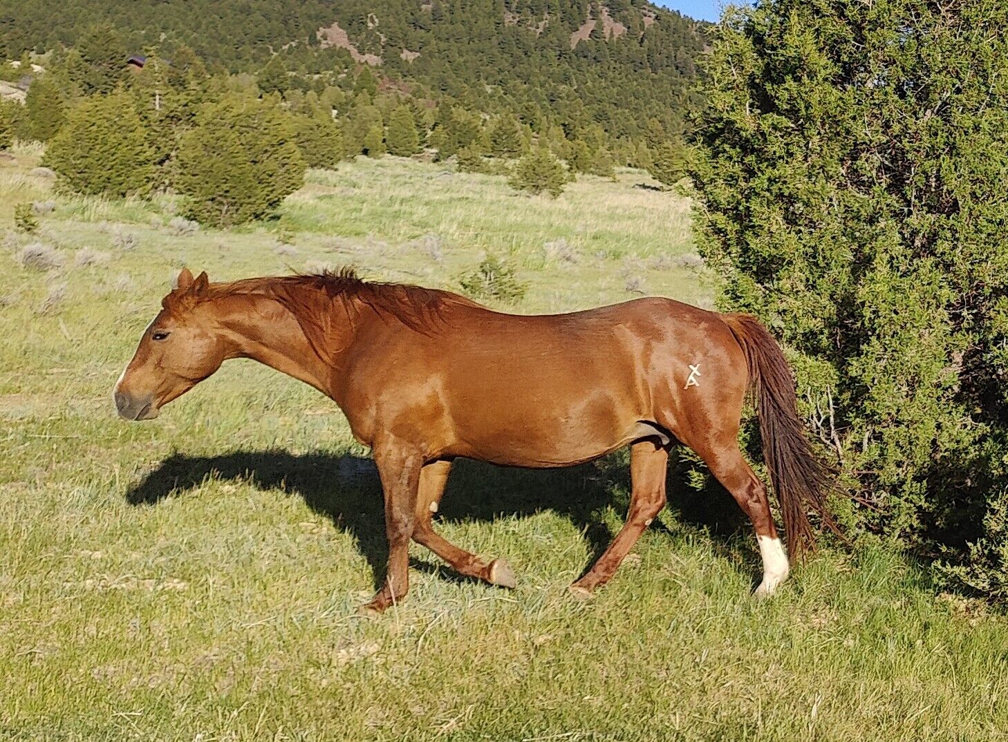 "Ginger" was raised and bred on the famous Weavers Ranch near Great Falls, MT. She was ridden as a young horse in all aspects of ranch work and retired to raising babies. She has produced some top notch foals for our program. Ginger is Ranching Heritage Challenge. She is a really well made sorrel mare that is easy to be around. She foals out easy and her foals are always athletic. Our farrier loves her feet too! She can be hard to give vaccines, we place her in a stock to make it easier. Easy to catch, trim, load, ultrasound and foal out. She has windpuffs on the back pasterns, but is sound as a broodmare. She is a heavy milker and starts building an udder 2-3 months prior to foaling. Lst couple years she gets edema a few weeks before foaling.