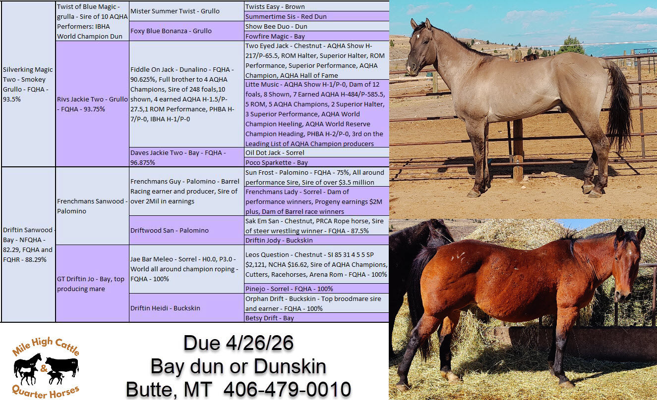 Bred to Silverking Magic Two, due late April. Foal is guaranteed to be bay dun or dunskin. Ultrasound suggested a stud colt.