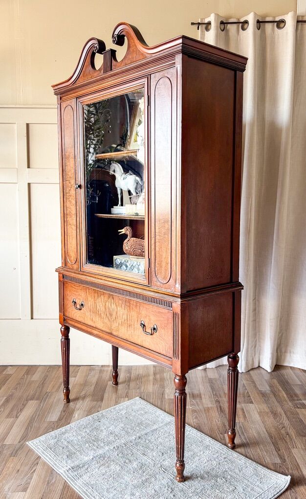 VenmoThis antique walnut Hepplewhite style china cabinet hutch is a stunning showcase of classic craftsmanship, featuring rich walnut tones and its original hardware that beautifully complement its timeless design. The upper cabinet displays two fixed shelves perfect for highlighting treasured trinkets, dishware, or collectibles, all framed by the original glass panel that remains in excellent condition with no chips or cracks. Below, the drawer has been thoughtfully wallpaper lined for a charming, elevated detail and opens and closes with ease. The piece shows minor age appropriate wear throughout, adding to its authentic character without taking away from its beauty. Elegant, warm, and full of vintage appeal, this cabinet is the perfect blend of display and storage!