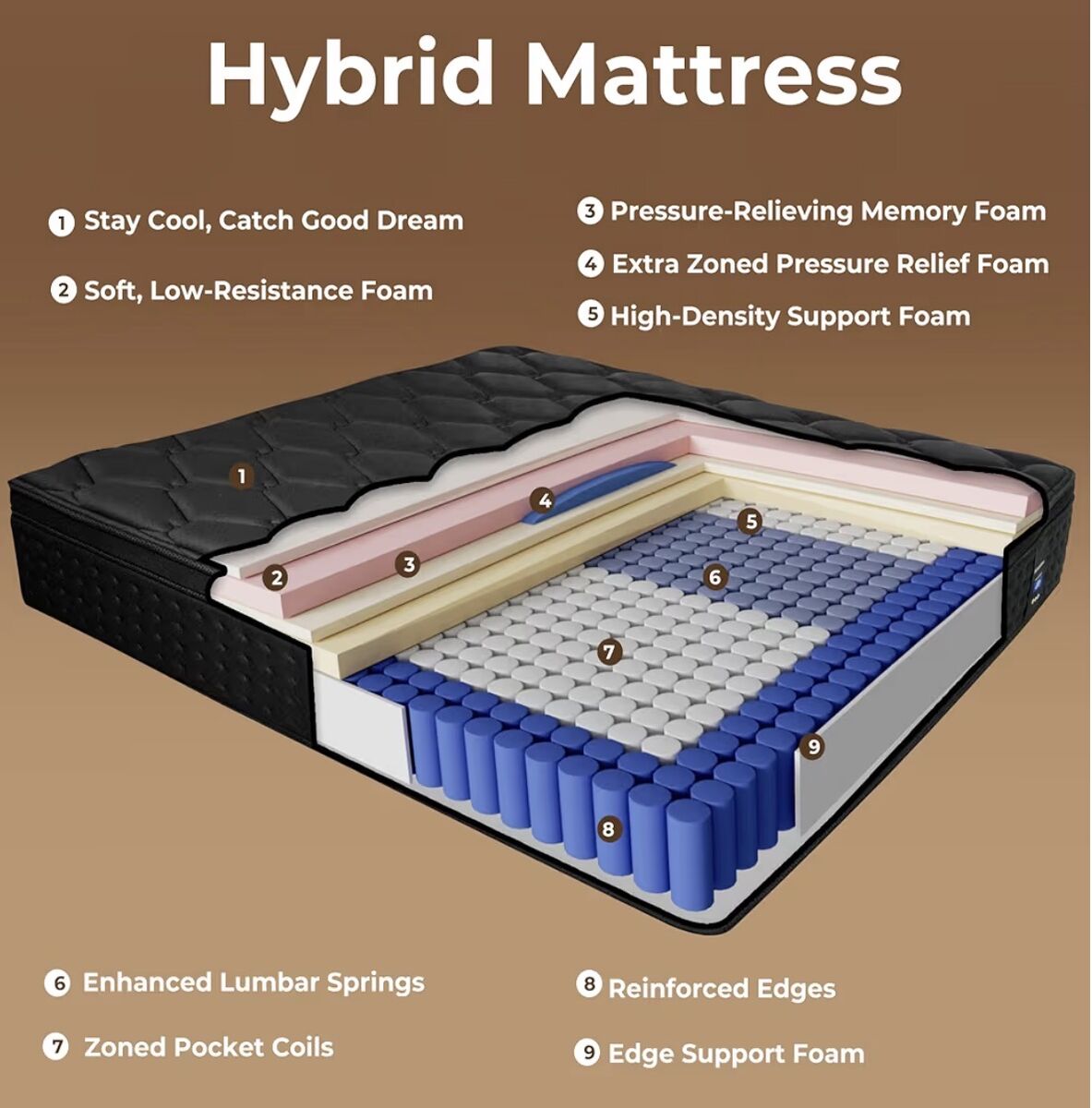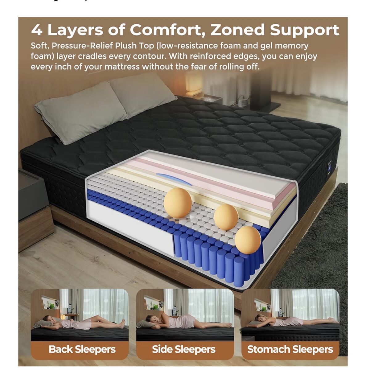 Comfortable Support The WinxMatrs 14 inch queen size mattress mixed with hundreds of individually pocketed springs and multi-layer memory foam, provides targeted support according to body curves, ensures that your weight is evenly distributed from head to toe, so that you can have a good night's sleep and be refreshed the next day. Breathable and Healthy This memory foam 14-inch queen mattress is made of high-density first-class material, which is comfortable breathable and nature, and can discharge the steam and sweat from the contact surface between you and the mattress, so that you can keep your body comfortable and dry during sleep. The mattresses independent pocket spring system prevents trapped heat for a cool and comfortable sleep. Motion Isolation This 14 inch queen mattress consists of high-performance pocket springs and high-density foam, which can effectively absorb the noise and vibration generated by turning over during sleep, without disturbing your companions, sleep with peace of mind. In a Box and Fits All Bed Frames The queen size mattress is compressed and packed in a box, allowing easy transportation to your room. Simply unbox and unroll the mattress with no intricate installation. Please allow 48-72 hours for full decompression and any potential odor to dissipate after opening the mattress. It is easy to set up and fits all kinds of bed frames, even on the floor. Whether you have a box spring, slatted frame, platform bed, or metal grid, this mattress is suitable and can be set up effortlessly. Quality Queen Size Mattress Individually wrapped coils for bounce & support + plush memory foam for pressure relief. Perfect for minimizes motion transfer. Responsive coils enhance support and isolate movement, perfect for couples and pet lovers. With reinforced edges, you can enjoy every inch of your mattress without the fear of rolling off.