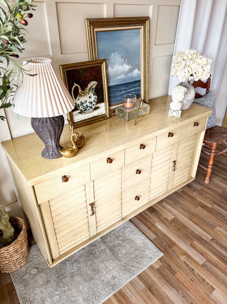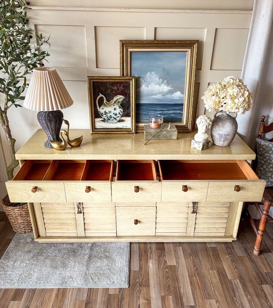 VenmoThis stunning vintage mid century modern blonde mahogany dresser is the perfect mix of sleek design and functional storage, showcasing clean lines, warm light wood tones, and eye catching slatted drawer fronts that give it that classic retro vibe everyone loves. The piece sits on its original wheels, making it easy to move and incredibly practical while still maintaining its authentic vintage character. It remains in great overall condition with only minor wear consistent with age, adding just the right amount of lived in charm. All drawers open and close smoothly with ease, featuring original hardware on the slatted drawers and stylish new copper hardware on the remaining drawers that adds a subtle modern touch while complementing the warm mahogany finish. Spacious, sturdy, and full of mid century personality, this dresser makes a beautiful statement piece for bedrooms, living spaces, or anywhere you need functional storage with timeless vintage style!