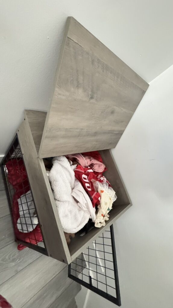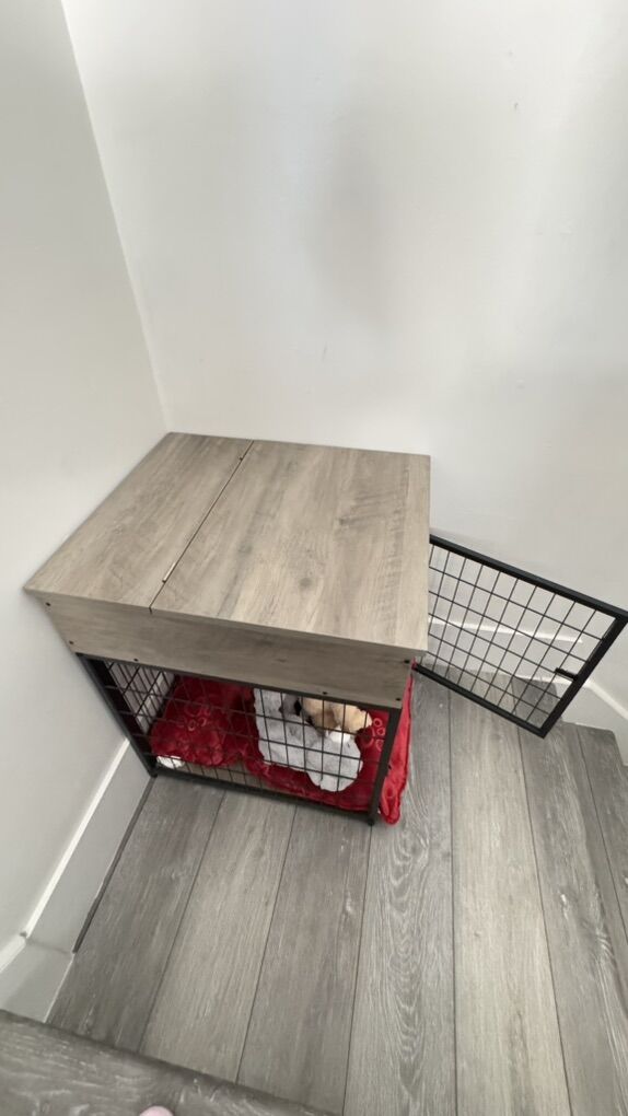ApplePayReally nice indoor pet crate with a wooden top so it doesn’t look like a typical kennel. Metal sides and door, opens easily, and works great as a side table or nightstand. Clean and well cared for