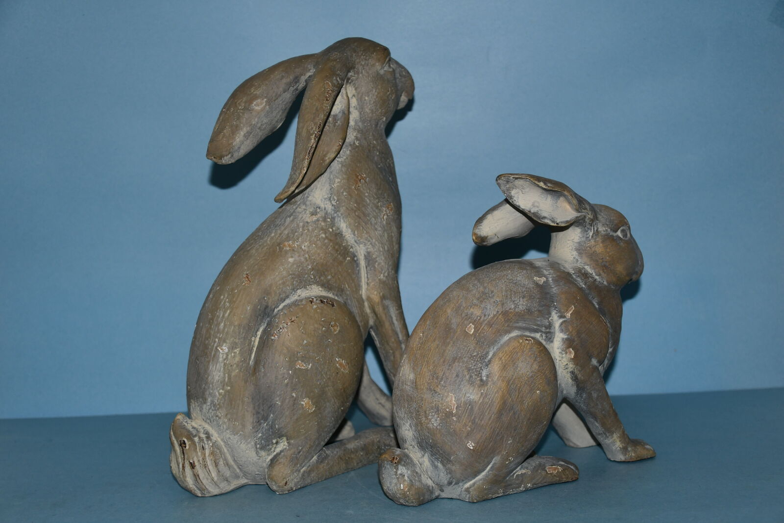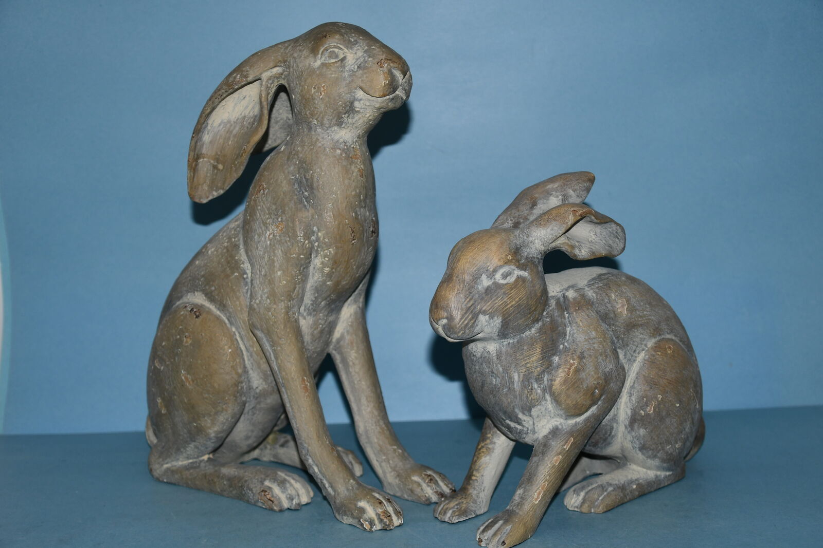 This Set of 2 LARGE BUNNY RABBIT FIGURINES are about 9" & 13". They are heavy. There are NO CHIPS! Questions??? Please ask. We are located in Plain City. Cash only please.
