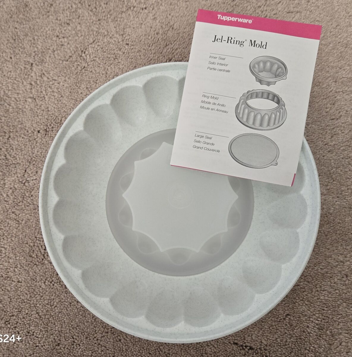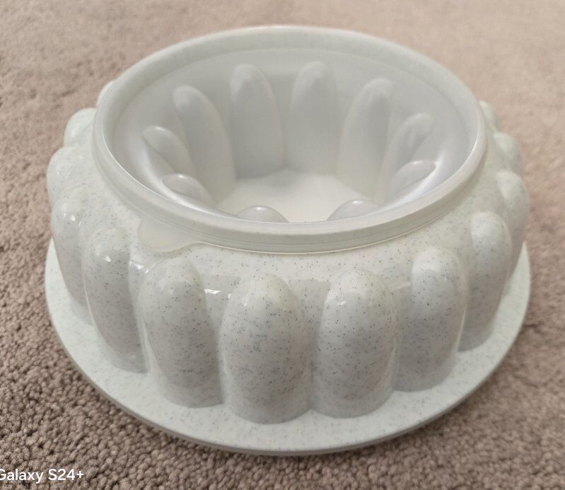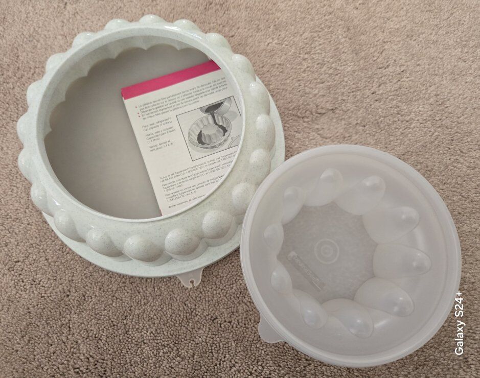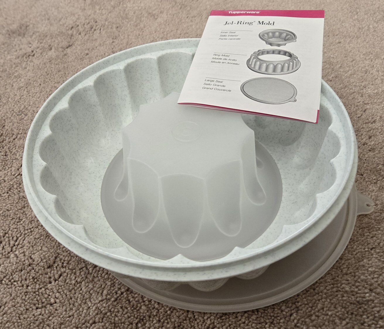 The 6 cup Tupperware 3 piece set Jel-Ring Mold is a new jello mold set made in the USA. It includes a speckled white and gray container, lid, and bowl, perfect for creating medium-sized ring-shaped desserts. The mold is refrigerator and dishwasher safe, easy to clean, and suitable for all occasions. Made of durable plastic, this set is a nostalgic collectible for those who appreciate retro kitchen tools and gadgets from the 1980s. Ideal for adults looking to add a touch of fun to their food-themed collection.