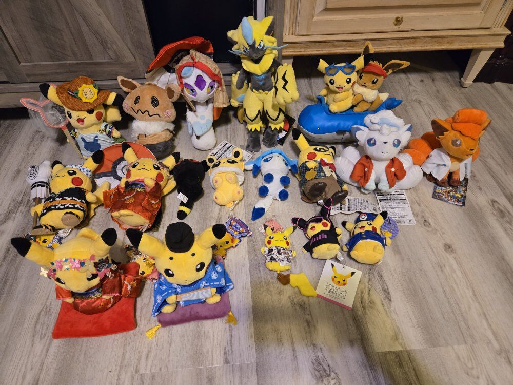 *Hiroshima Pikachu: $10 *Pokemon Center Limited Hyakpoke Yagyu Vulpix Plush Toy W/Tag: $120 *Pokemon Center PIKACHU & EEVEE Toy Seasons Summer Days Wailord W/Tag: $200 *Pokemon Center Gentleman Pikachu 2018 Plush Stuffed Toy W/Tag: $100 *Pokemon Center Pikachu Summer Life Stuffed toy Bug Net W/Tag: $200 *Pokemon Center Maiko Han Pikachu sitting ver. Pokemon Kyoto limited plush W/Tag: $150 *Pokemon Center Zeraora Pokemon Center Plush Japanese 2018 Limited W/Tag: $50 *Glaceon plush: $5 *Umbreon Plush: $5 *Pokemon Center Original Limited Plush Doll Mascot Pikachu 2018 Pink JPN OUTBREAK: $20 *Pokemon Center Limited Alola Vulpix Hyakupoke Plush Doll W/Tag: $100 *Pokemon Center Prince Pikachu sitting ver. Pokemon Kyoto limited plush W/Tag: $150 *Pokemon Center Tokyo Station Limited Pikachu Plush Doll Station Master uniform W/Tag: $40 *Mimikyu Eevee Plush Doll: $20 *Pokémon Center 2018 Hyaku Poke Yako Froslass Plush Doll W/Tag: $250 *Jolteon plush: $5 *Pokemon Center Original Kyoto Limited Maiko Pikachu 2016 Plush Kimono W/Tag: $120 *Pokemon Center Tokyo DX Limited Edition Pikachu Plush Doll Firefighter Costume W/Tag: $150