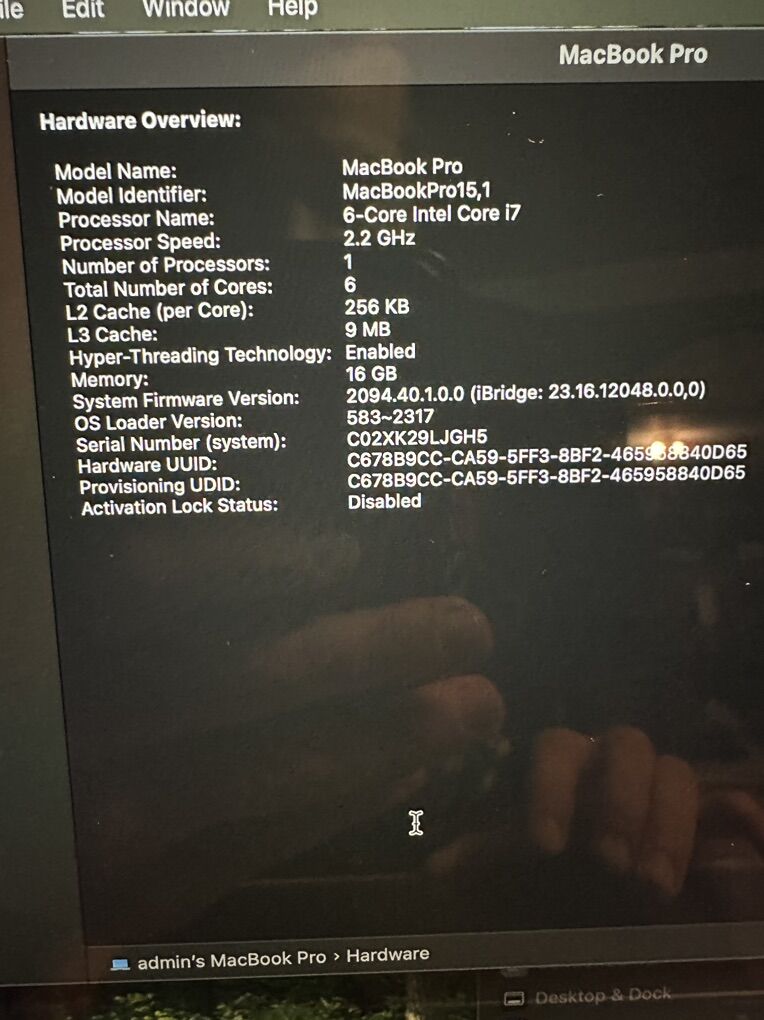 MacBook Pro 15-inch, 2018 Storage 500gb SSD Processor 2.2 GHz 6-Core Intel Core i7 Graphics Intel UHD Graphics 630 1536 MB Memory 16 GB 2400 MHz DDR4 Sequoia 15.7.3