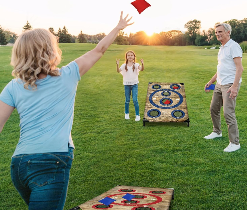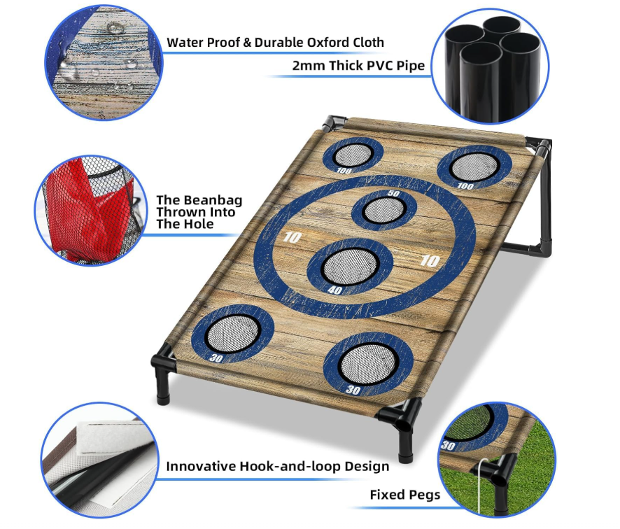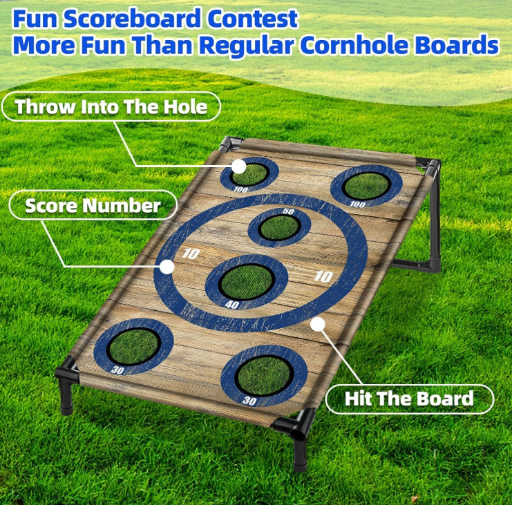 ZelleEasy To Store And Carry: This funny corn hole board set includes 2 removable boards(3*2FT), 8 bean bags, a storage bag, an instruction booklet, and 8 metal stakes for stability. Perfect for portability and compact storage