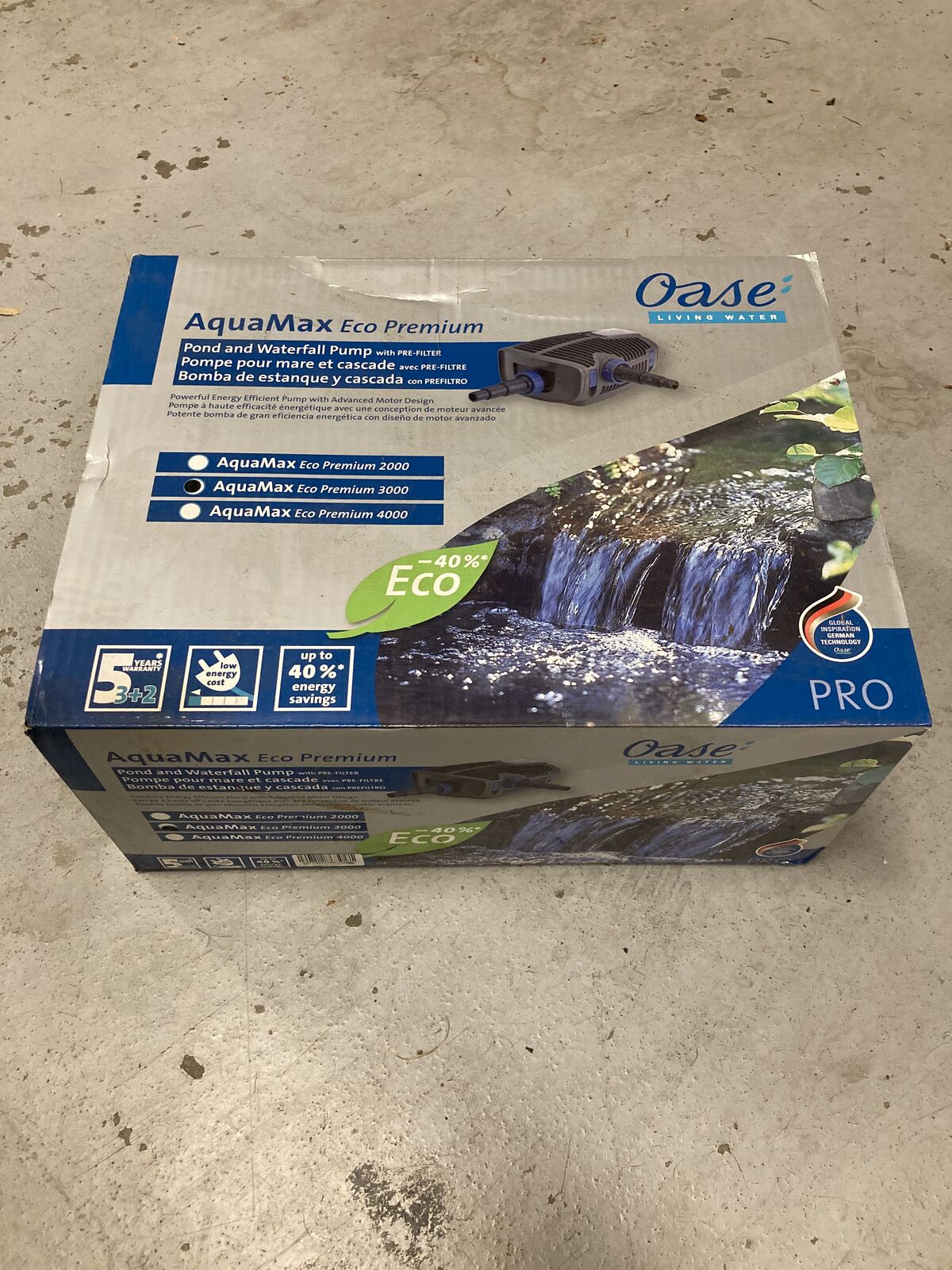 Aquamax Eco 3000 pond pump rated at 3000 gallons per hour with 2 inlets.