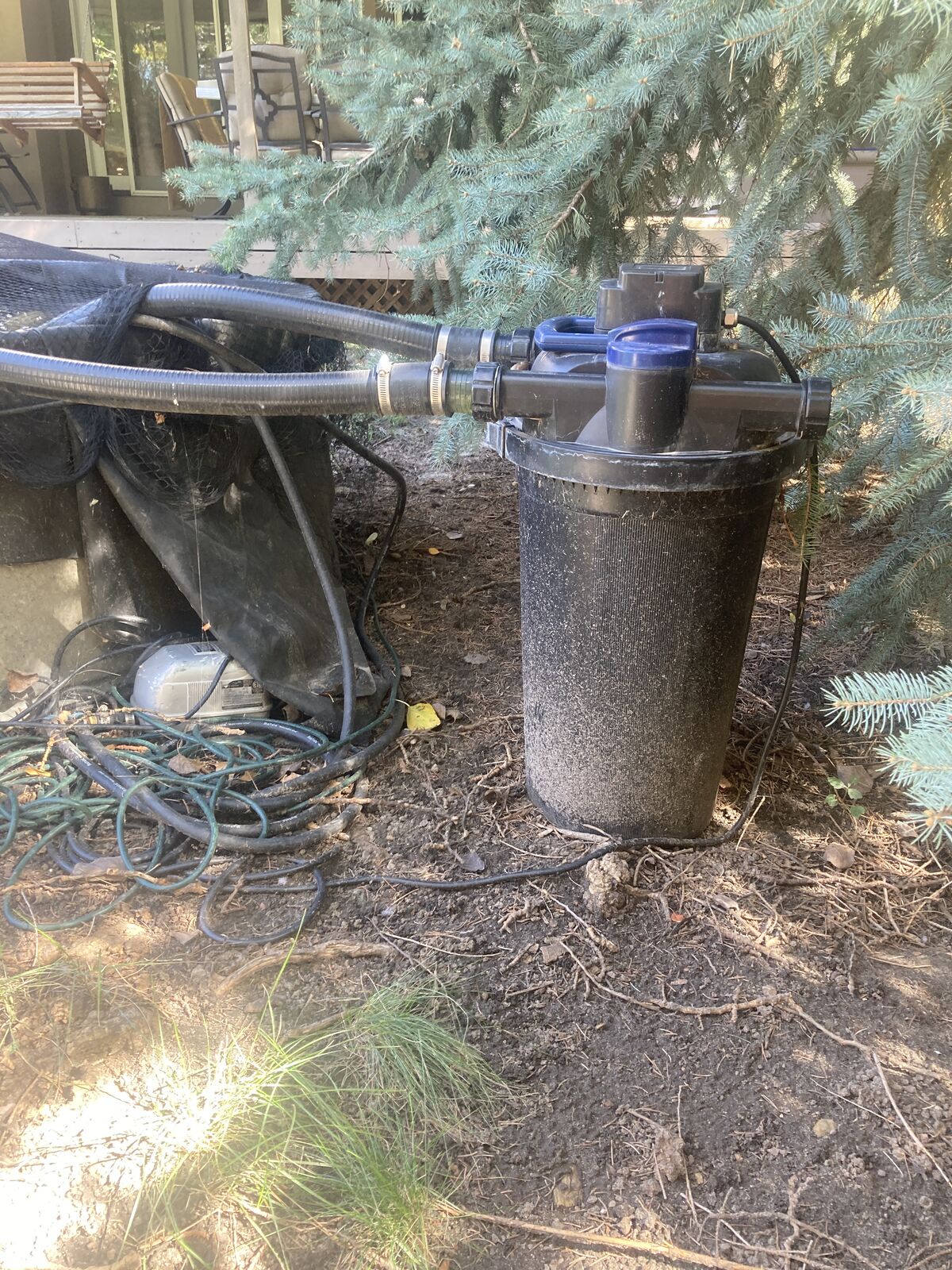 8000 pond filter with 40 watt UV light and quick back flush. (Direct fish waste water to your garden, our strawberries grew like crazy)