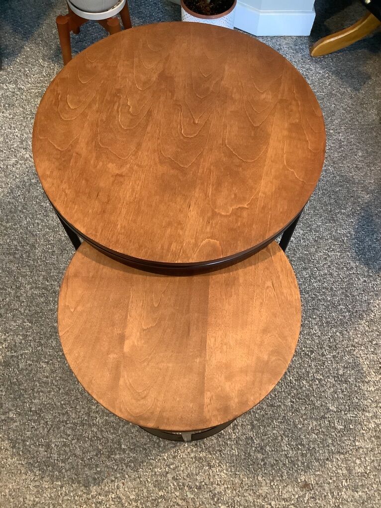 2 end tables in good condition Small 19 3/4” tall 14 1/2” around Large 21 3/4” tall 19” around