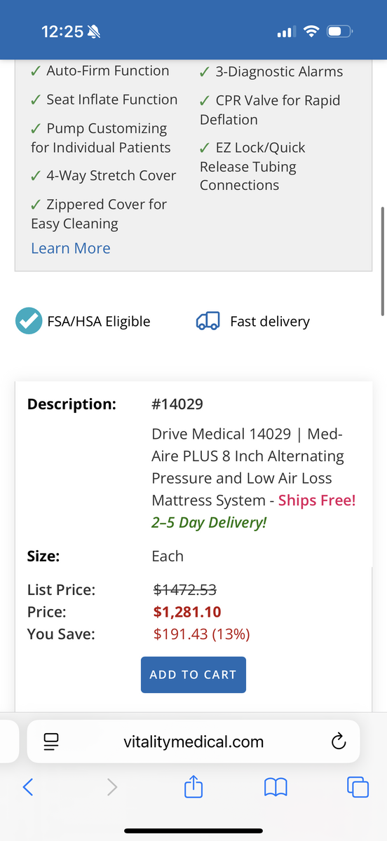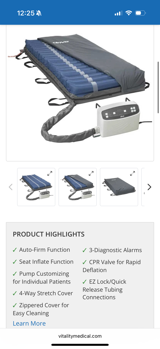 Drive Med-Aire Plus Alternating Pressure and Low Air Loss Mattress is for patients who need to reduce or prevent decubitis ulcers. Through alternating pressure, the mattress can dynamically change patient pressure points and improve patient circulation. Other benefits of the system include microclimate control and friction reduction. The low air loss mattress is safe because it has air cells designed to minimize chance of mattress to bottom out. If there are any problems with the mattress, there are 3 audio and visual alarms that go off before it becomes a bigger issue. The mattress construction includes twenty different air cells. Three of these cells stay filled or static at the head to keep patient comfortable during alternating cell therapy. Nine of the twenty cells come with laser hose in order to keep the patient cool and comfortable. They also decrease the needed recovery time. The pump included with the mattress delivers eight liters per minute. When the air pumps in, it goes through kink-proof spring lined tubing. In case of emergency, the mattress has CPR valves for incredibly quick deflation.