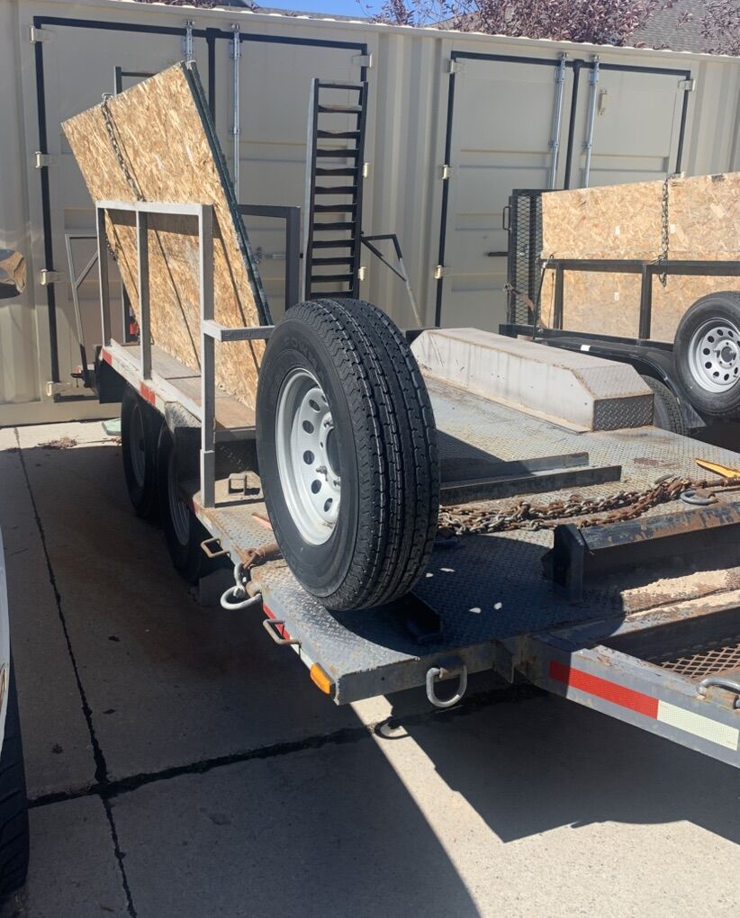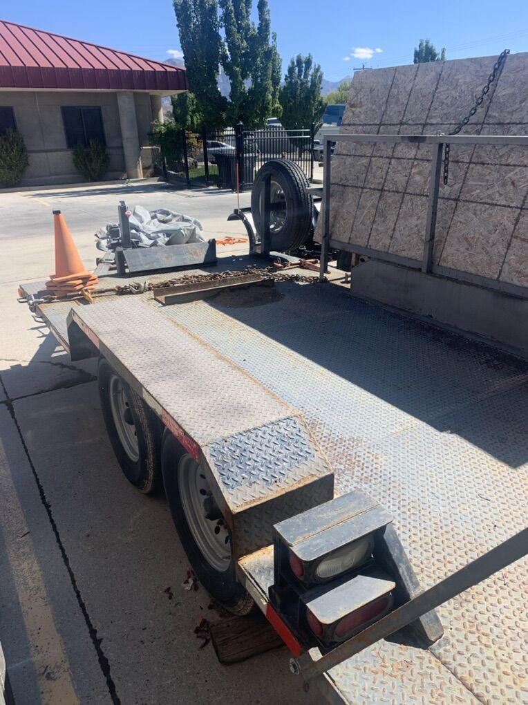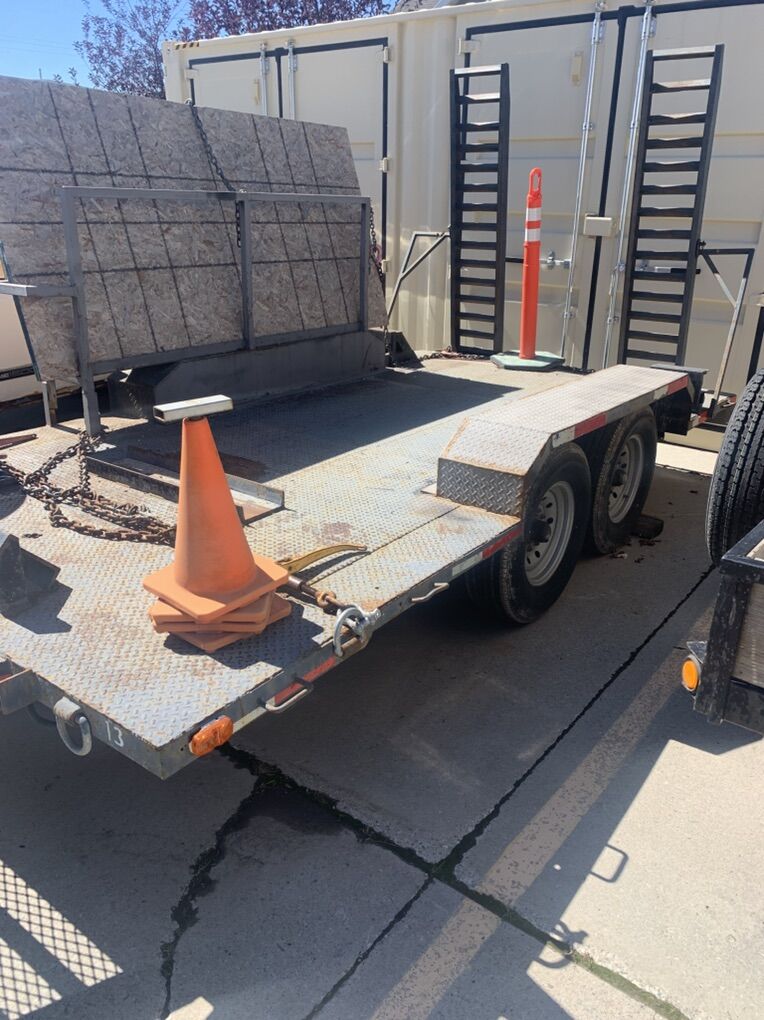 1990 double axle trailer, 8’ by 14’ bed, good tires, new spare tire