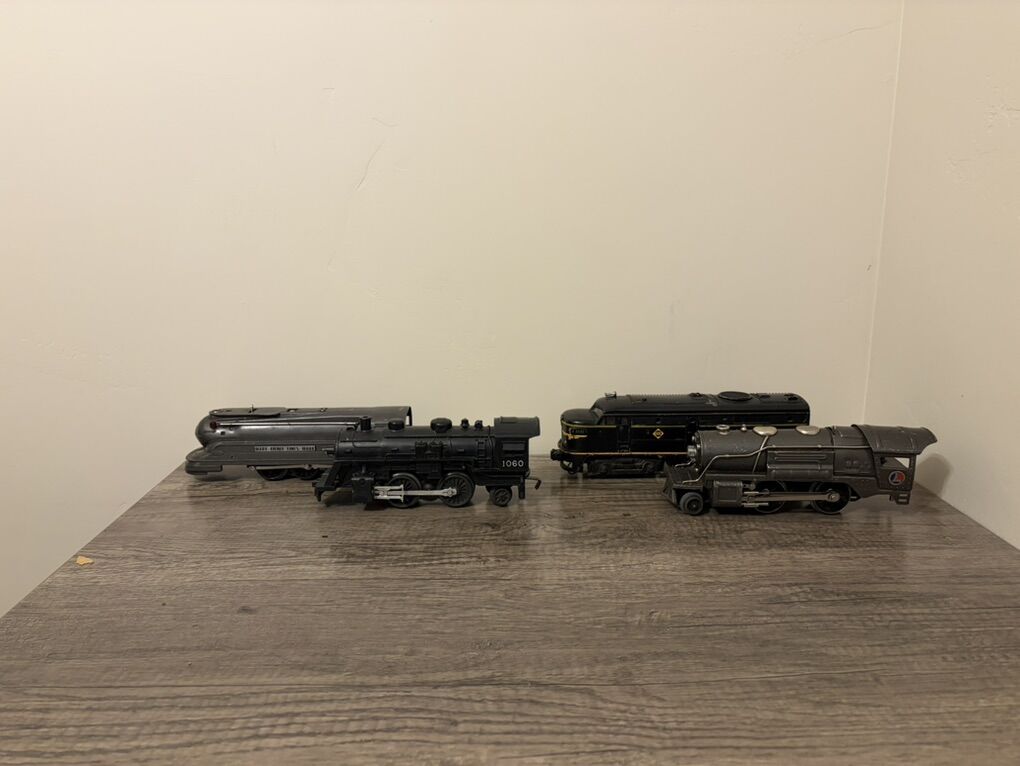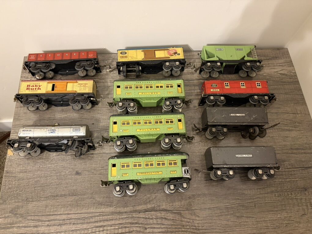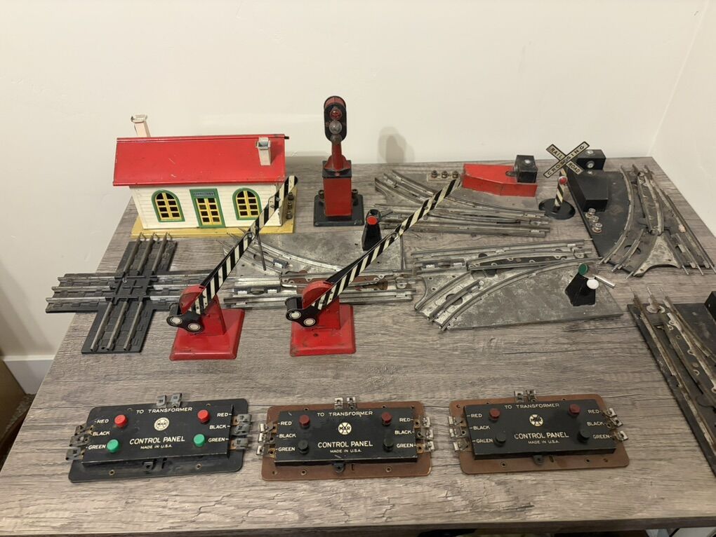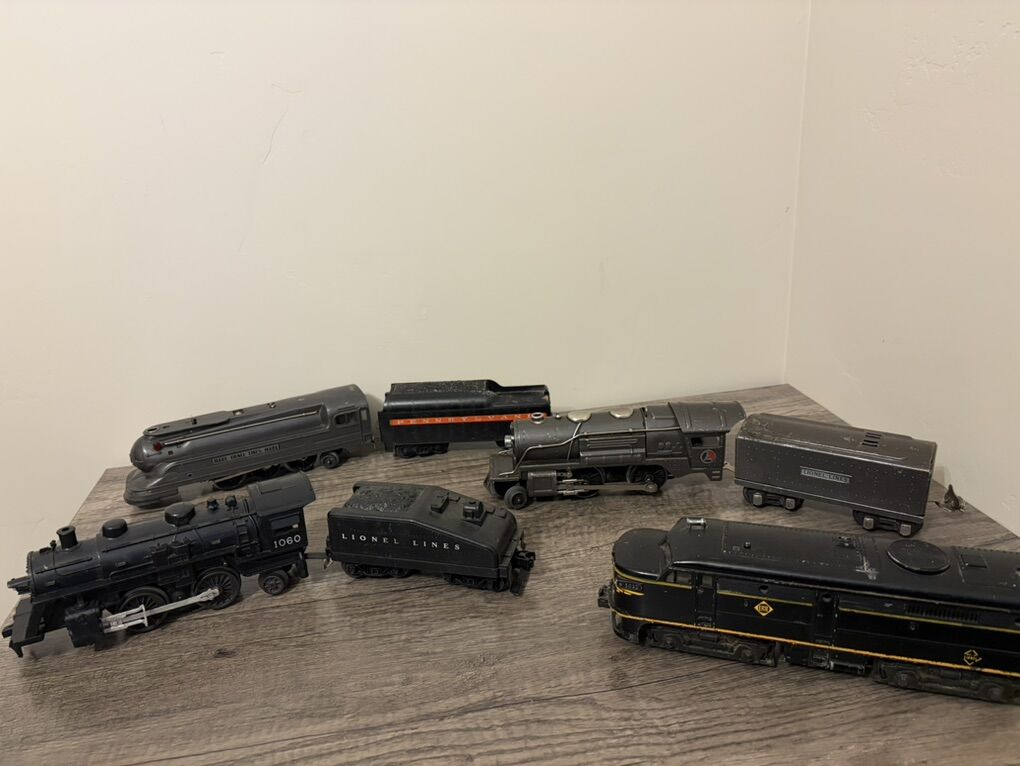 70 to 80 years old. Gauge 0 trains. 23 cars. 2 prewar engines( 259E, 1668E ). 2 postwar engines ( 2032, 1060 ). Other accessories. Collectors dream! All engines work and move.