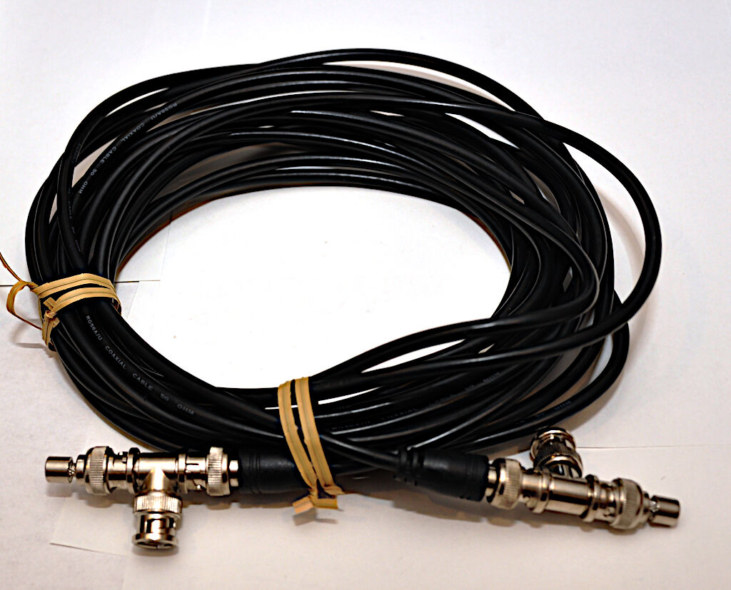 The short cable is approximately 10 feet long. The long cable is approximately 30 feet long. Cables are marked RG-58 A/U.