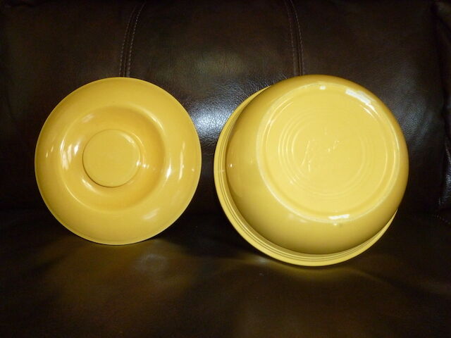VenmoKitchen Kraft items are hard to find. This is the medium size. It measures 7 15/16 inches wide x 4 inches tall, to the top of the lid. They started making these in 1936. They only made them till 1944. It is marked Kitchen Kraft on the bottom. The lid is in mint condition. The bottom shows minimal wear. The original five colors of Kitchen Kraft/Fiesta they started with are yellow, green, cobalt blue, red/orange, and ivory. This is one of the original colors. Original Kitchen Kraft is known for having factory flaws. These could be dimples, pinpricks, sand bumps, uneven glaze and glaze skips. The bottom of this has a few small missed glaze spots that never show. Because they are on the bottom. There is a tiny chip on the rim of the bowl. Overall condition is great. A fun unusual piece for a lover of Fiesta and Kitchen Kraft. Selling for a parent so the price is firm.