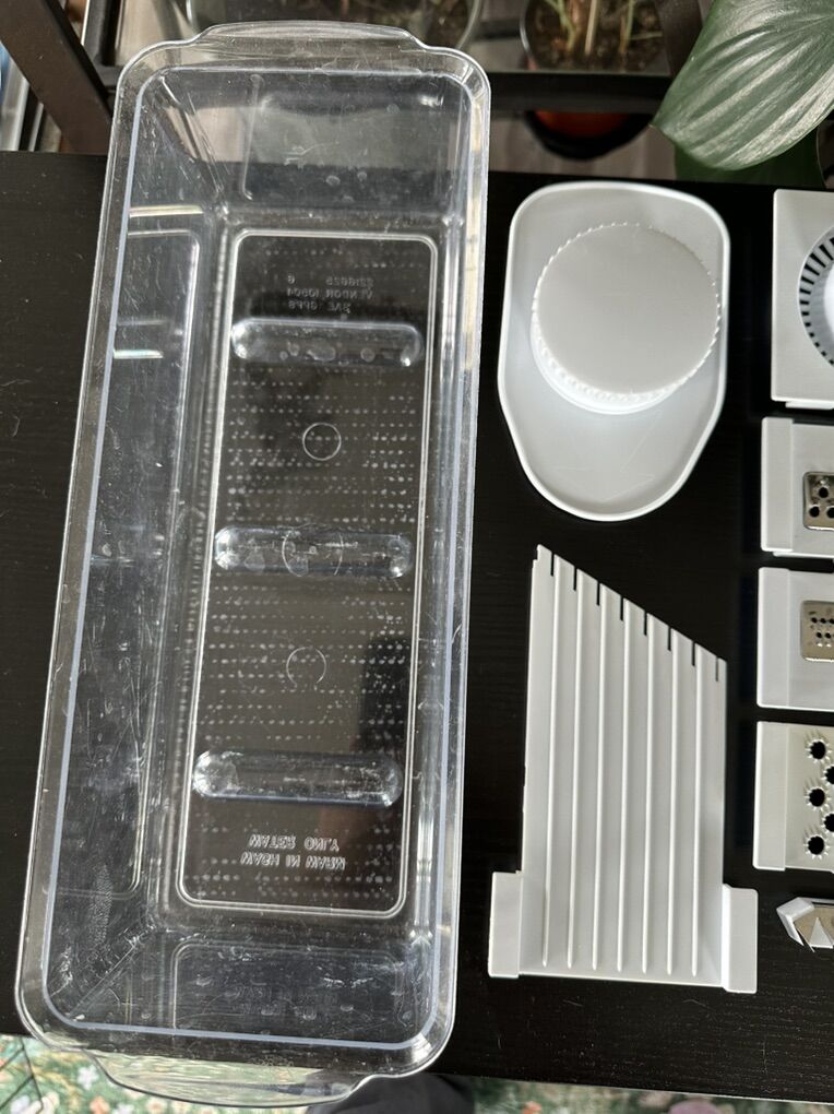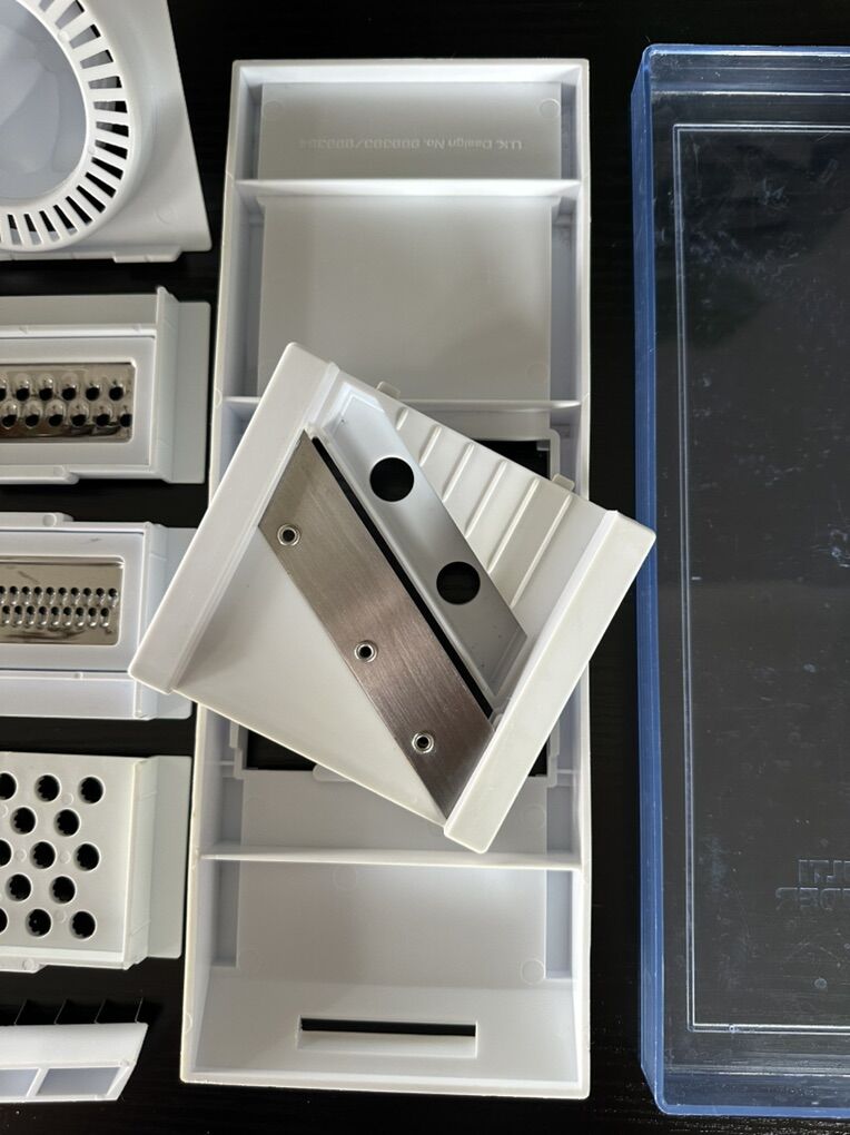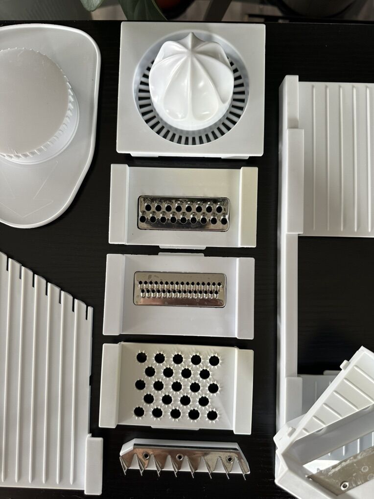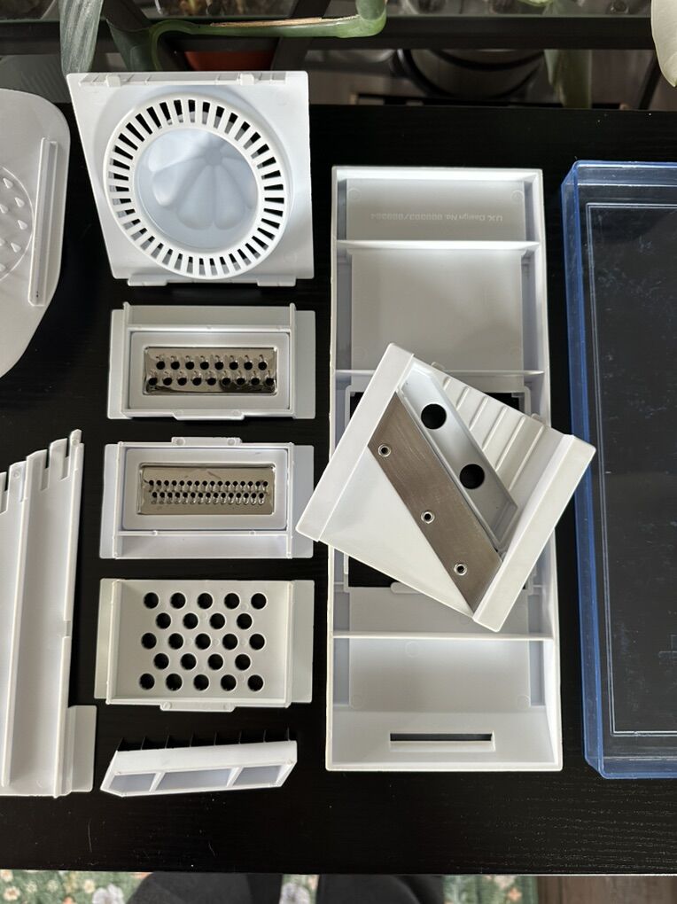 Versatile kitchen mandoline slicer set. Has different grater and slicer blades, a citrus juicer, and two clear containers. Great for chopping veggies or grating cheese. All pieces are clean and ready to go.