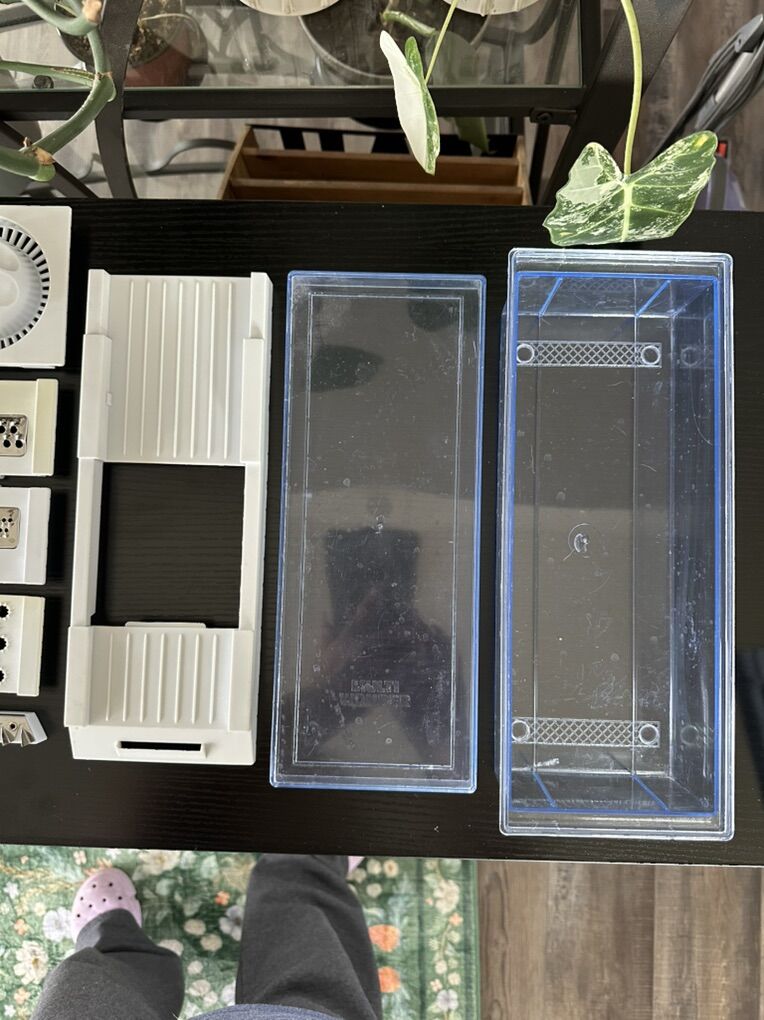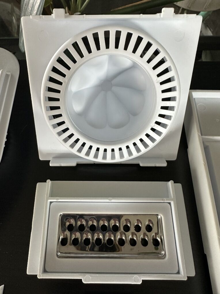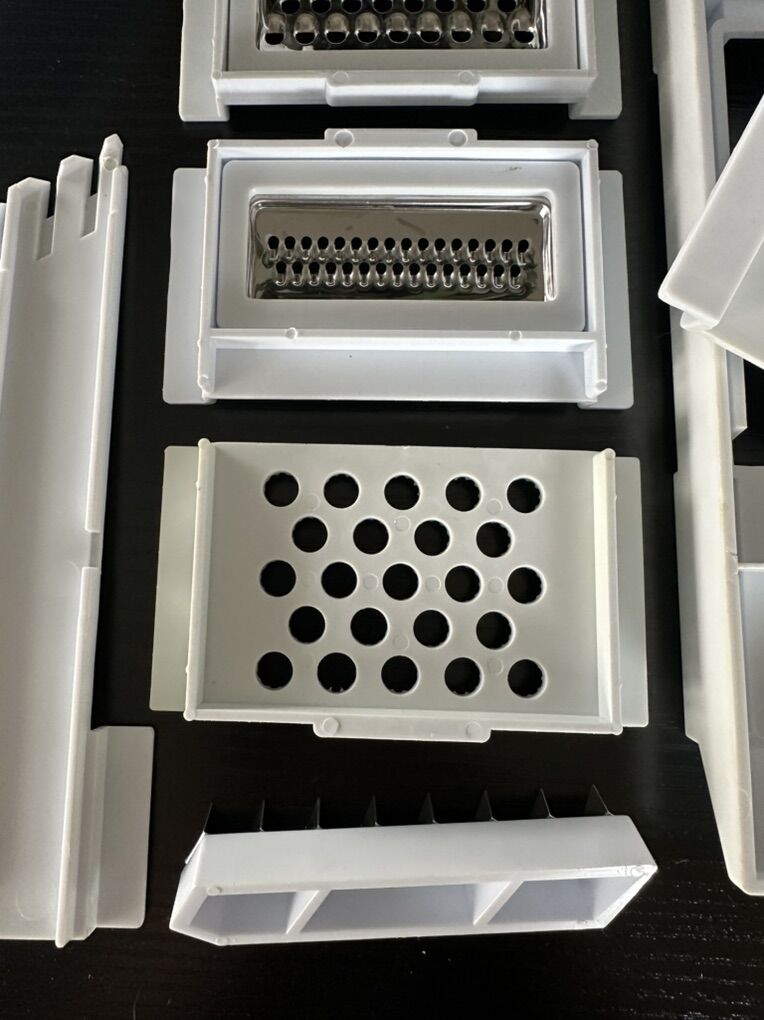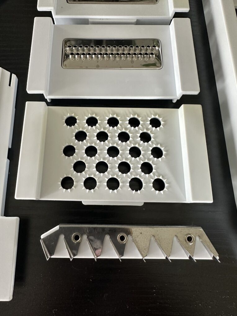 Versatile kitchen mandoline slicer set. Has different grater and slicer blades, a citrus juicer, and two clear containers. Great for chopping veggies or grating cheese. All pieces are clean and ready to go.