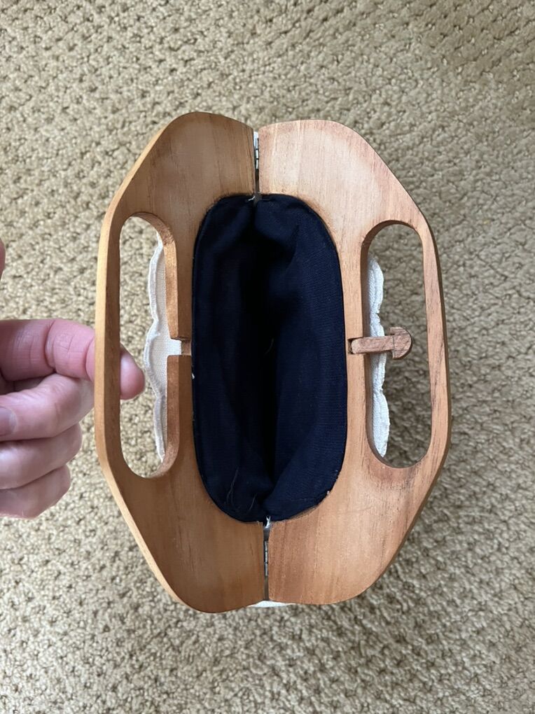 VenmoHow fun is this?! It is the same on both sides. It has a wooden handle with a flip lock that opens and closes it. The inside looks like it has never been used. The embroidery is really nice and the buttons add a fun touch. This is 8 inches across x 6 1/2 inches tall. A unique fun find. In a smoke free home. Selling for a parent. Price is firm.