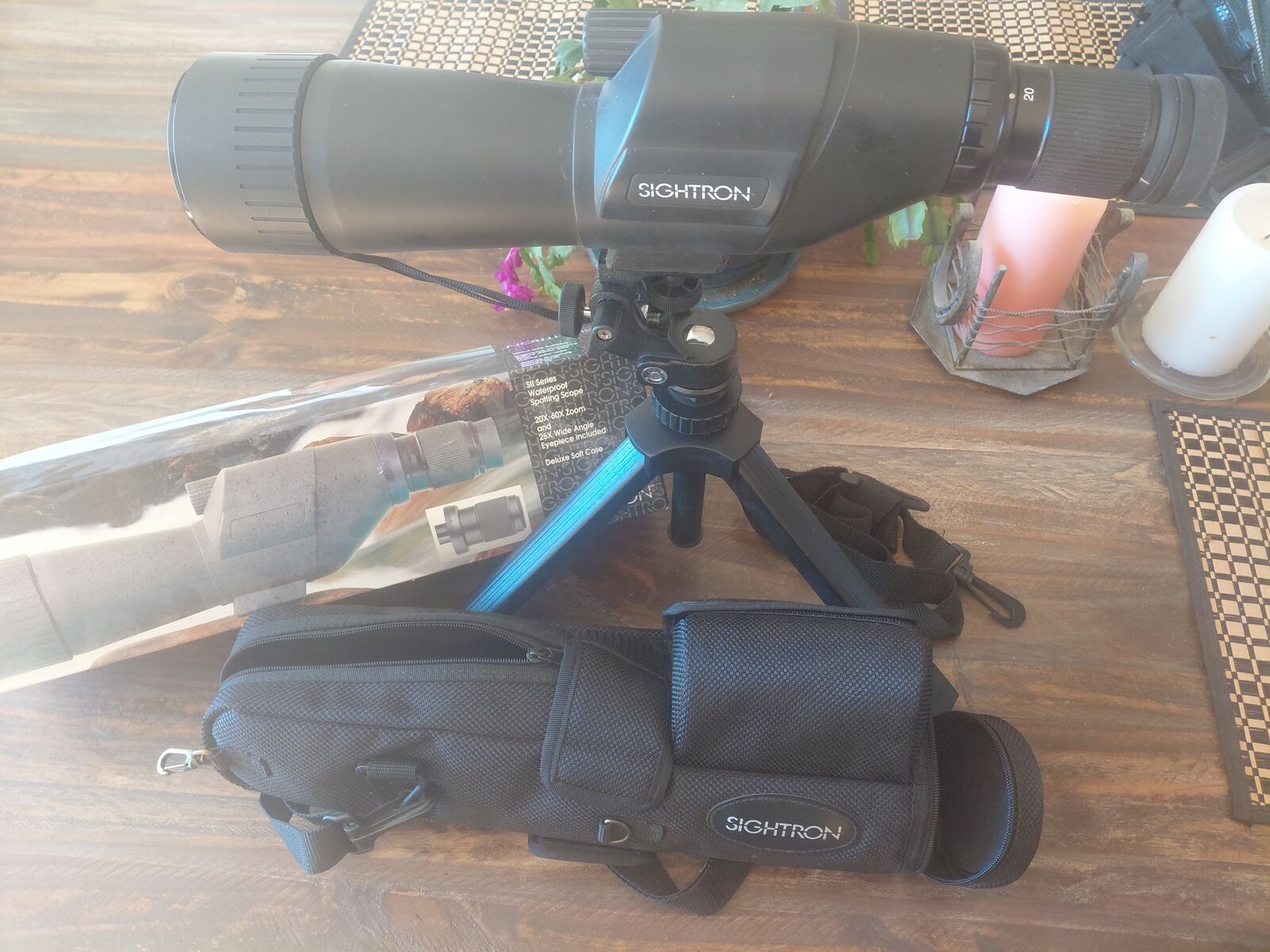 Venmo20x60x63 with expandable tripod and 25x magnifier. Has deluxe carrying bag too; brand new (if you can find it in stock) is $1,570
