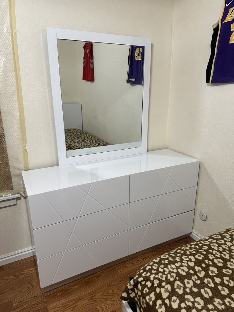 VenmoHigh Laquer White Twin Size Bedroom Set Good condition Has tiny wear but nothing is broken, all drawers work good Twin size bed (mattress not included) Night stand Dresser with mirror