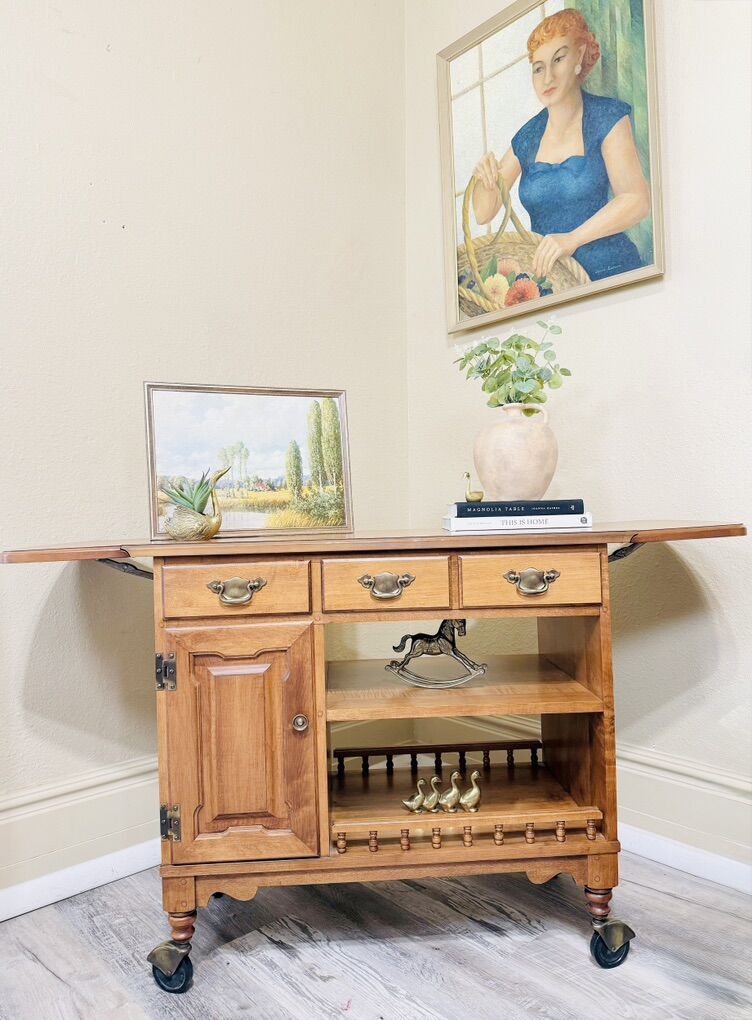 VenmoAdd timeless character to your space with this beautifully crafted vintage tea cart from the renowned Tell City Chair Company, stamped and dated from the 1950s. Made from solid wood with a warm, rich finish, this piece showcases classic mid-century craftsmanship and enduring quality.