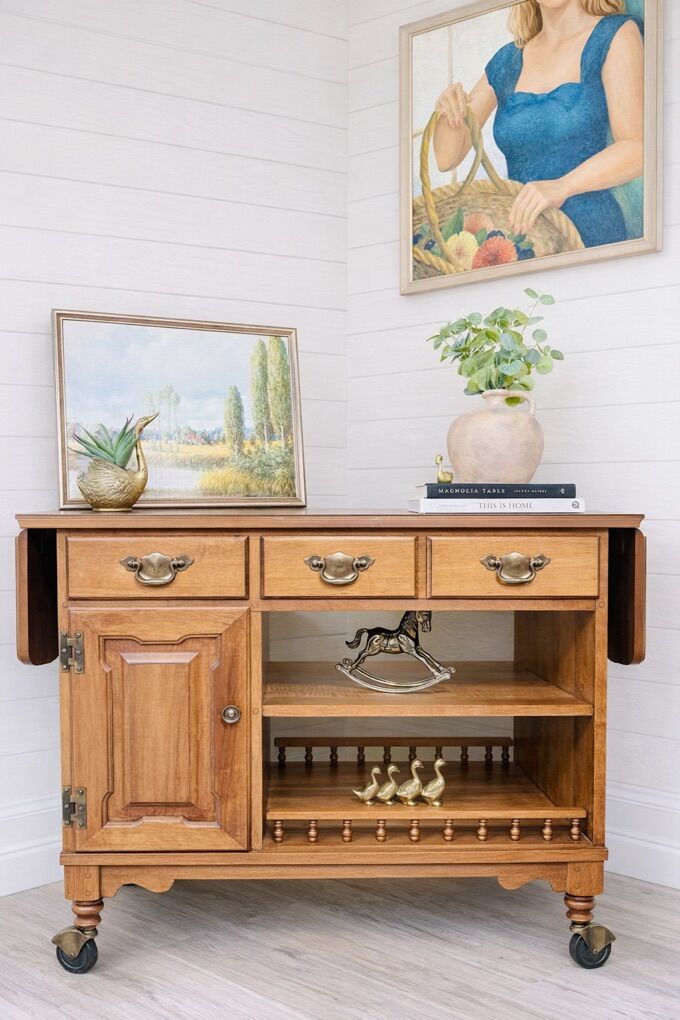 Featuring two spacious drawers with ornate brass handles, a side cabinet for discreet storage, and open shelving perfect for display, this cart blends function with vintage charm. It rolls smoothly on original brass wheels, making it ideal for entertaining or styling as a statement piece in your home.