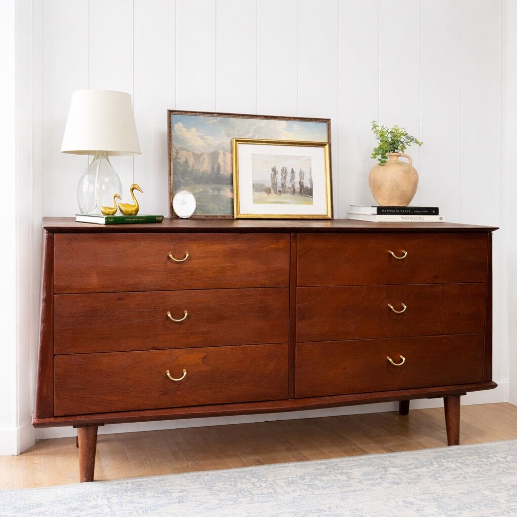 With six spacious, smoothly operating drawers, it offers ample storage for your bedroom or can function beautifully as a media console or stylish entryway piece. This dresser is in excellent vintage condition, showing only minor signs of age that add to its character. It’s stamped September 15, 1953.